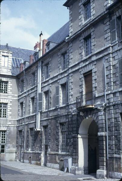 Corps d'entrée (aile sud) : les façades et toitures ; le passage d'entrée ; les caves - Grand corps de bâtiment est : les façades et toitures ; la terrasse bordant sa façade postérieure ; à l'intérieur, au rez-de-chaussée : les salles voûtées d'arêtes et celles voûtées en berceau, le vestibule ; le grand escalier de pierre ; les caves - Corps de bâtiment nord : les façades et toitures ; à l'intérieur, au rez-de-chaussée : le vestibule et les salles voûtées ; à l'étage : la chapelle ; l'escalier ; les caves - En totalité, le grand bâtiment sur la rue Edouard-Branly, construit en 1803-1804, pour abriter la salle des exercices et les dortoirs du lycée impérial - Les sols des cours (cad. IO 20) : inscription par arrêté du 17 juin 2004