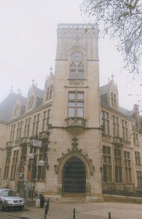 Commencé en 1913 d'après les plans de Henri Tarlier, repris à partir de 1919, l'édifice est achevé en 1926. La construction reprend le style néo-gothique pour évoquer les période faste de l'histoire communale. L'aménagement intérieur présente une structure poteaux-poutres de béton et de maçonneries apparentes.
