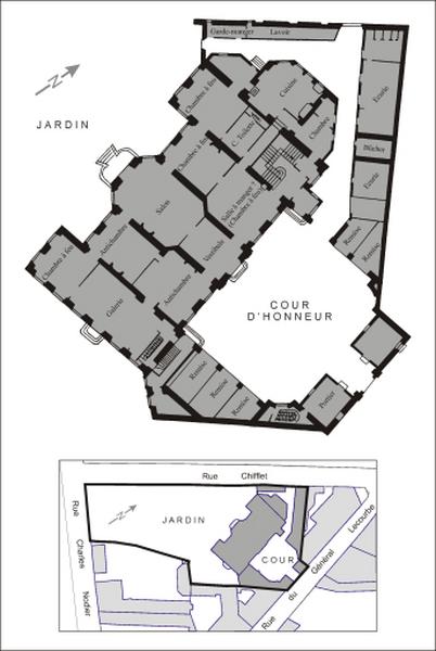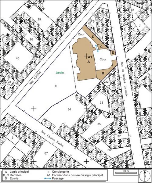 L'hôtel en totalité, y compris les éléments de décor immeubles par destination, à l'exception de ceux de l'étage du corps de logis, les sols des cours, des terrasses et du jardin, les clôtures et leurs portes (cad. AP 4) : inscription par arrêté du 18 décembre 2001