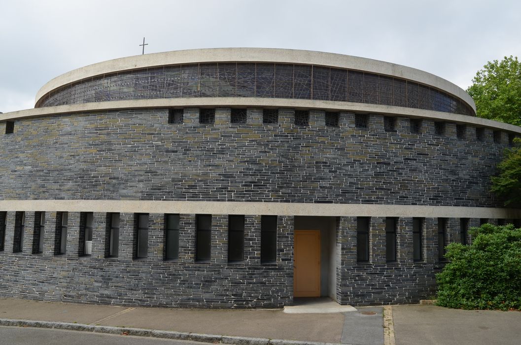L'église du Landais est un édifice circulaire de trente mètres de diamètre. Les murs sont en béton avec un parement extérieur de schiste débité en parements très fins. Le mur extérieur, sans fenêtres basses permet d'isoler les fidèles des bruits alentours. Ce mur n'est d'ailleurs pas porteur et offre un dessin circulaire pur avec cette absence de piliers extérieurs. Le clocher de l'église est dissocié de l'église et se déploie sur une hauteur de vingt mètres. Il est surmonté d'une croix de 5 mètres.