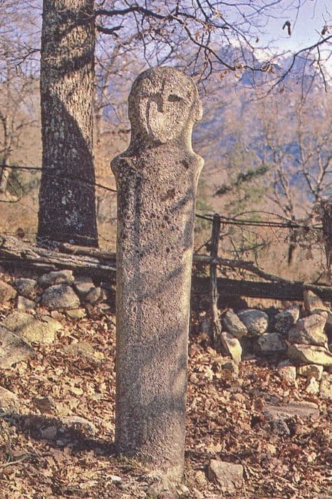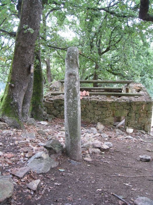 L'architecture mégalithique en Corse se développe dans un contexte de cultures sédentarisées. Cette statue-menhir a été découverte au début de l'année 1961. Elle gisait, entière, quasiment enterrée, à quelques mètres de l'endroit où elle est actuellement visible, à proximité d'un castellu, fortification médiévale probablement implantée sur une occupation antique et protohistorique du second âge du fer. Les fouilles menées autour de l'emplacement ont permis de découvrir des vestiges possible d'un dispositif de calage ainsi que du mobilier lithique daté de la fin du Néolithique ou du début de l'âge du bronze. ££D'une hauteur de 2,42m, la statue-menhir sculptée en ronde-bosse dans du granit, est l'une des silhouettes les plus anatomiques de l'île. La tête arrondie présente deux reliefs saillants au niveau des oreilles, un bloc nez-arcade en relief, des yeux rapprochés en creux et une bouche fermée figurée par une courte gravure. A l'emplacement de la ligne claviculaire, un arc de cercle en relief relie les épaules saillantes. Des gravures de croisillons (aujourd'hui disparues) évoquaient une chevelure ou une résille. La face postérieure des épaules en relief et l'emplacement de la colonne vertébrale en creux constitue par ailleurs un schéma classique observé sur bon nombre de statues-menhirs insulaires.£
