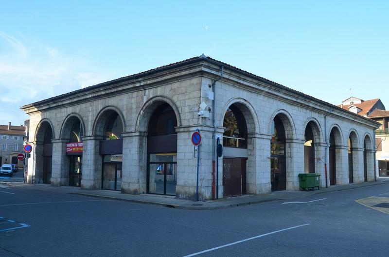 Halle aux grains construite de 1830 à 1843 par l'architecte Stupuy. Plan rectangulaire divisé intérieurement en deux vaisseaux et six travées par une ligne de cinq colonnes doriques. Ouvereture sur l'extérieur par quatre arcades sur la largeur et six sur la longueur. Bel exemple d'architecture classique pyrénéenne.
