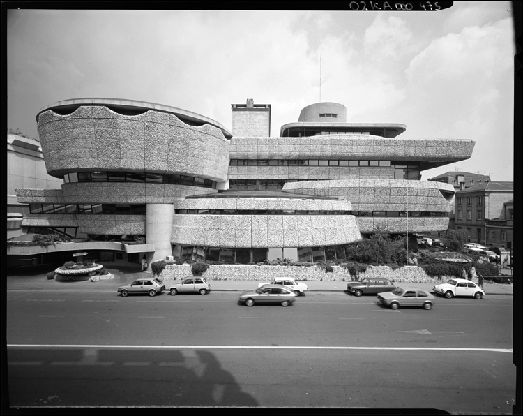 le parti-pris d’immeubles cruciformes prévalant dans le quartier, construit un édifice constitué de plateaux circulaires successifs, créant une impression de densité et d’irrégularité accentuée par l’inclinaison des murs et le parement de pierre des parois. A cet extérieur répond à l’intérieur une organisation de l’espace reposant sur un jeu de courbes et de contre-courbes et que magnifie un vaste atrium central.