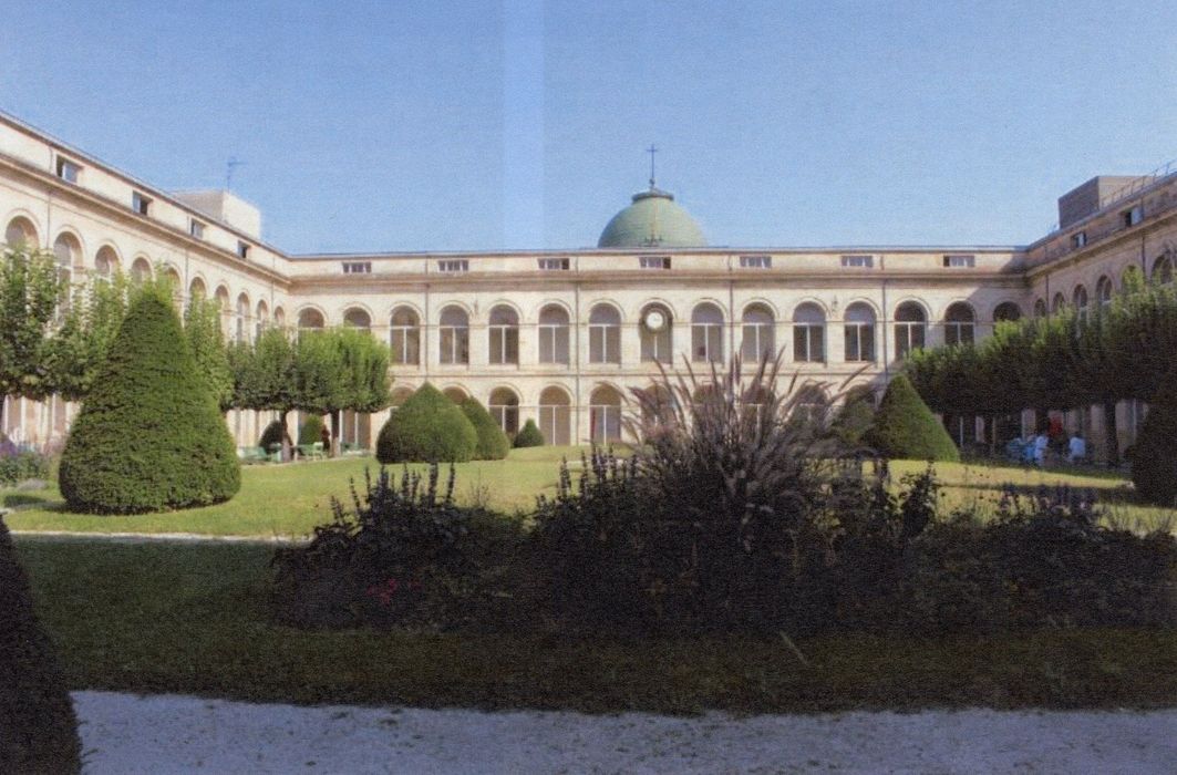 topiaires d’ifs taillés en cône soulignent la composition de la cour accompagnant le dessin des façades et des parterres de gazon. Deux alignements de tilleuls ont été plantés parallèlement aux ailes Est et Ouest soulignant ainsi l’axe central de l’hôpital. Le dessin du jardin n’a pas fondamentalement changé depuis
