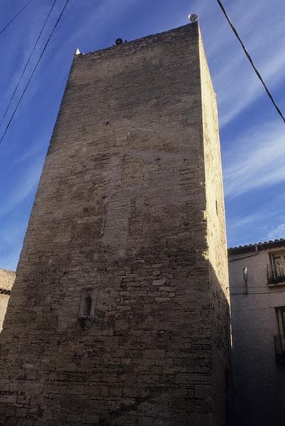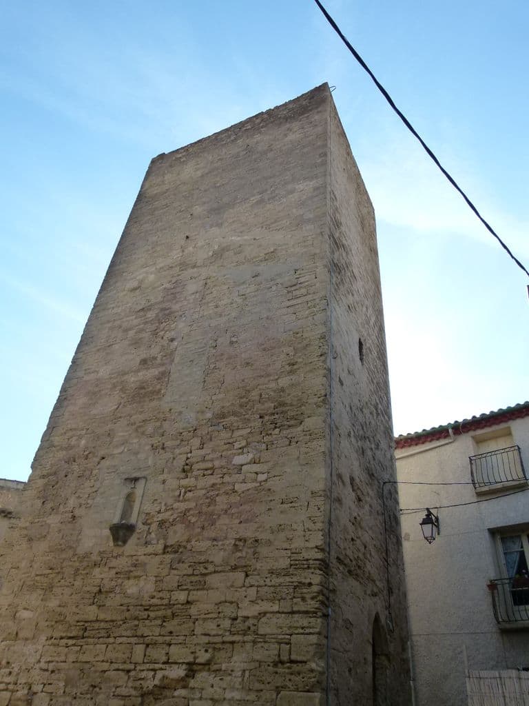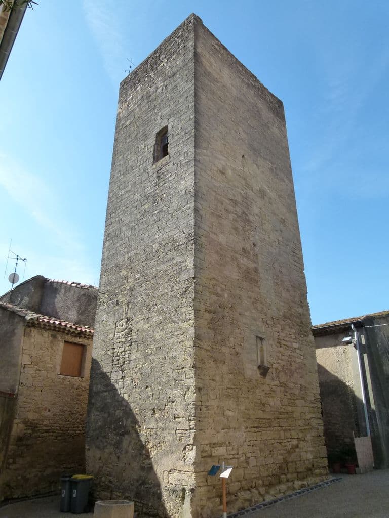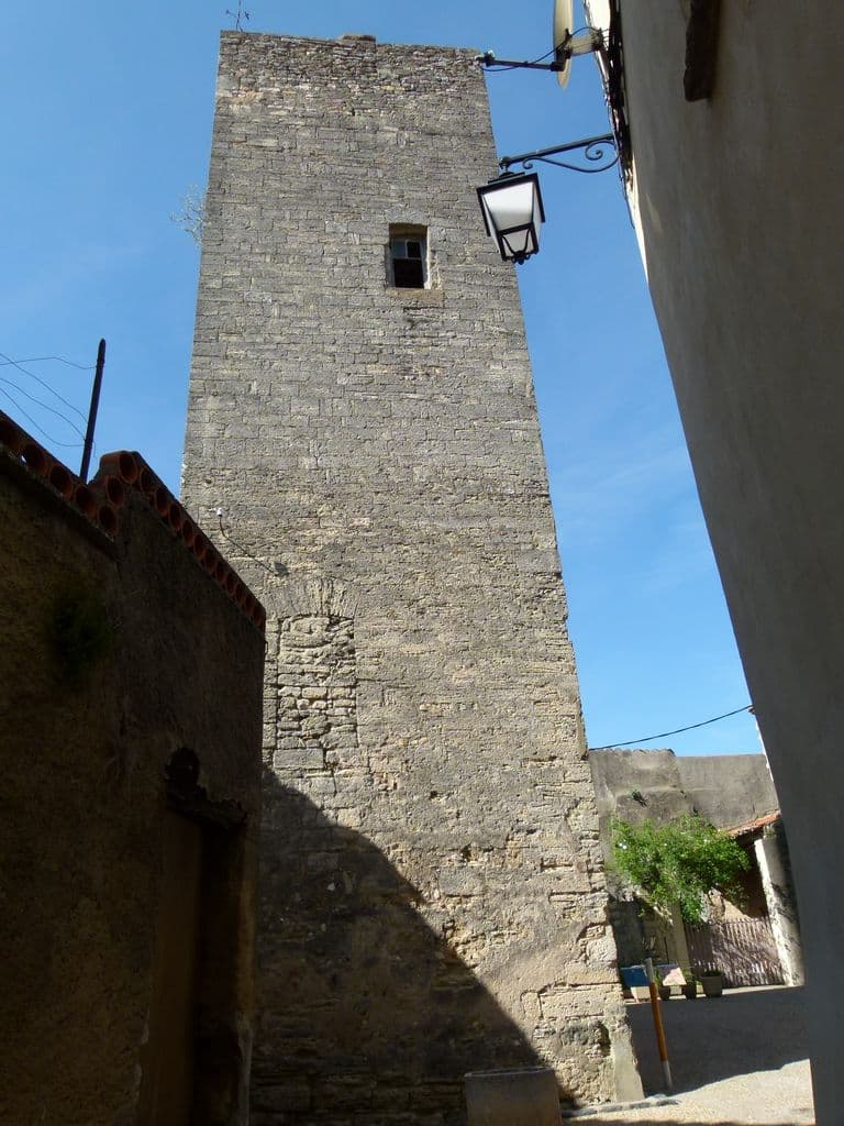 Il sagit dune tour-beffroi datant du 12ème siècle. Elle assumait un rôle de surveillance mais aussi symbolique comme affirmation du pouvoir seigneurial. La fonction dhabitat y est quasiment nulle et les surfaces réduites et exigües. Cette tour possède trois niveaux voûtés en berceau : le premier niveau servait habituellement de stockage. Laccès aux deuxième et troisième niveaux se faisait, à lorigine, par la porte haute de létage (aujourdhui murée). La terrasse sommitale supporte le campanile et sa cloche. Au 17ème siècle, la tour fut utilisée comme grenier à sel et, au 19ème siècle, une horloge mécanique fut installée.