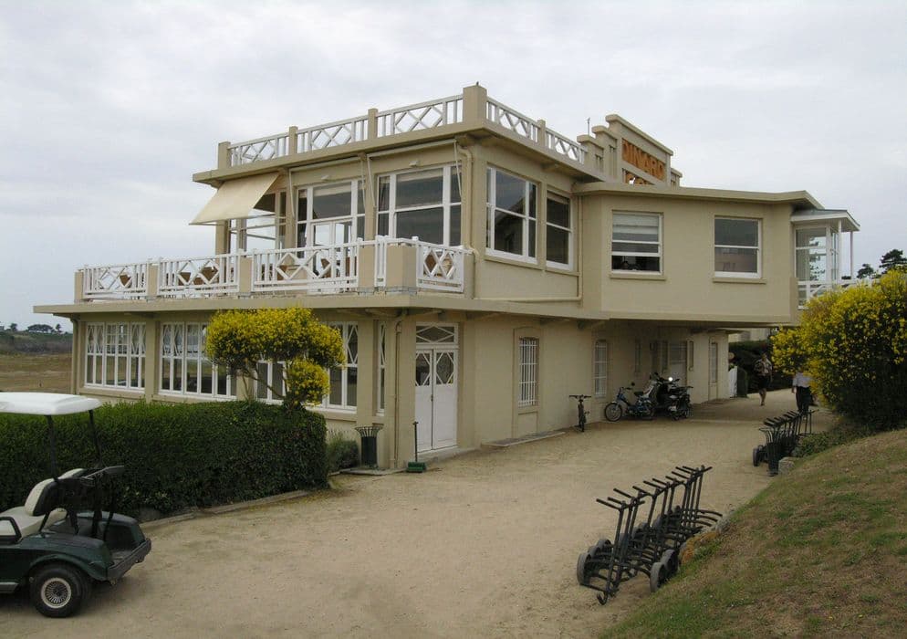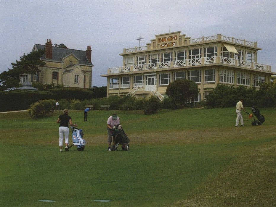 Le golf est officiellement créé en 1890 par la communauté britannique de Dinard. Au premier club-house en pierre, bois et ardoise édifié en 1892, succède, en 1927, lactuel bâtiment de style Art Déco. Dabord établi sur deux niveaux, il est, par la suite, couvert dun toit-terrasse abritant un bar-restaurant. Lédifice adopte une structure simple, à planchers et poteaux de béton, et est éclairé par de larges baies. Deux enseignes sinscrivent en lettres géométriques dans les frontons ajourés des garde-corps, dominant lensemble de la construction.