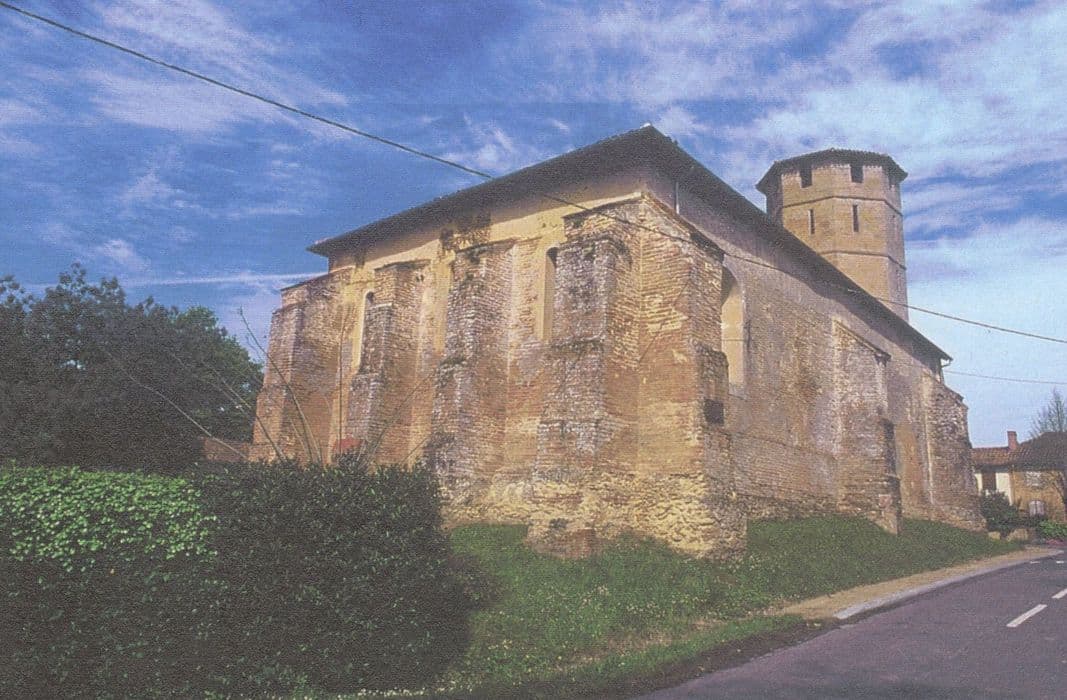 Edifice du 15e siècle à chevet plat, disposant d'un porche surmonté d'un clocher-porche polygonal. La porte d'entrée, abritée par le porche, présente un arc brisé en tiers point surmonté d'une archivolte, l'ensemble étant coiffé d'un gâble cantonné de deux pinacles. A l'intérieur, la nef initialement charpentée est couverte d'une voûte en plâtre du 17e siècle. Le voûtement du choeur est réalisé en briques et semble dater du 17e siècle. La sacristie actuelle est une petite construction des 16e ou 17e siècles, accolée au mur sud du choeur. L'église fut pillée par les protestants lors du passage des troupes de Montgomery en 1569.