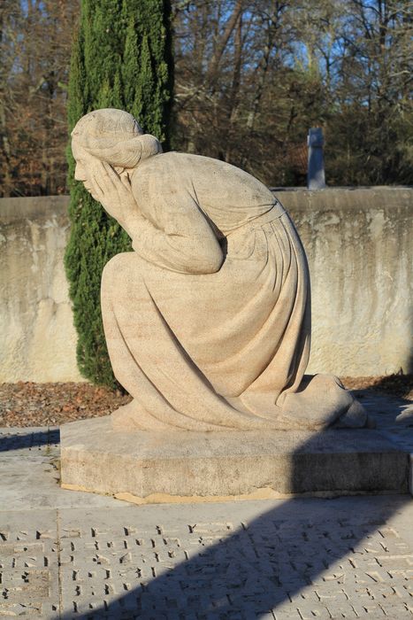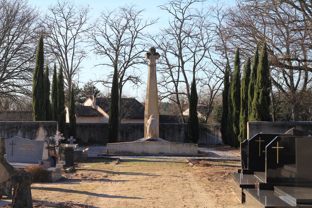 En 1921, le conseil municipal décide de regrouper les soldats morts pour la France et d'adjoindre un monument commémoratif. Le projet est confié aux architectes Henri Dépruneaux et Charles Sanlaville. Les sculptures sont dues à Henri Charlier. Le monument représente une femme agenouillée au-dessus de la plaque recouvrant le caveau, sur laquelle sont gravés les noms des victimes. En face, une croix porte, en bas-relief, un poilu blessé et un soldat enroulé dans un réseau de fils de fer barbelés. Une touche régionale est apportée par la sculpture d'un berger et de pommes de pin. Quelques traces de polychromie subsistent. A l'origine, le monument devait être entouré d'une composition végétale qui n'existe plus.