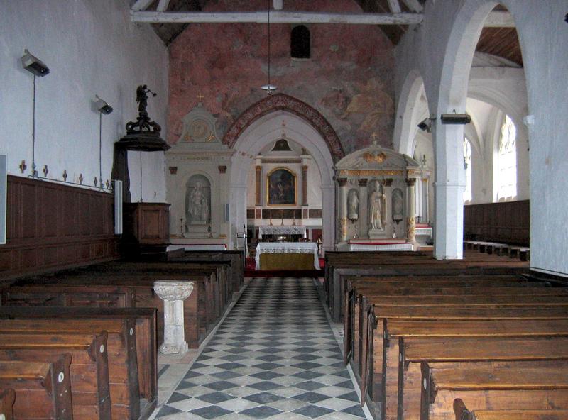 Cette église a vraisemblablement été construite au début du 12e siècle (nef couverte d'une charpente, choeur de trois travées dont l'une est surmontée d'un clocher). Au 16e siècle, elle a été agrandie par l'adjonction au sud de quatre travées d'un collatéral. Une partie des voûtés d'ogives du collatéral a été remplacée par un plafond lambrissé après un incendie. Une galerie formant porche s'élève devant la façade occidentale et le long du mur nord de la nef (jusqu'à la saillie du bas-côté). Cette galerie date de la fin du 15e siècle, ou du 16e siècle. Les poteaux qui la supportent reposent sur un muret de pierre.