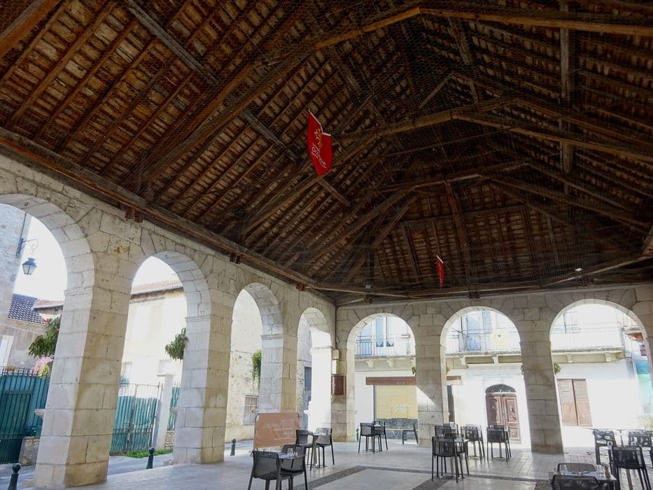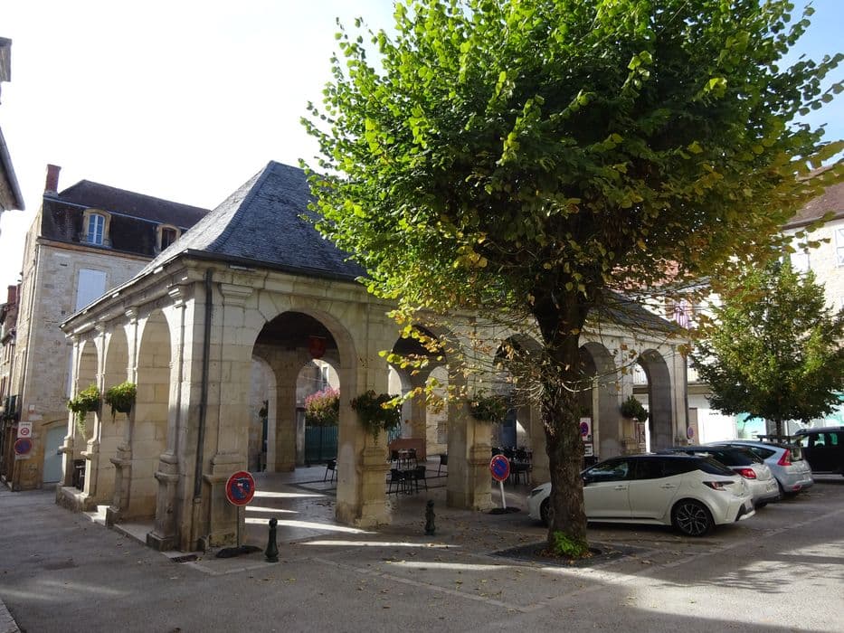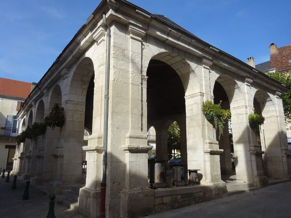 Halle construite de 1832 à 1836, sur l'emplacement de quatre maisons. Edifice de plan rectangulaire, sans division intérieure, dont les quatre côtés sont ouverts par des arcades de pierre. C'est un des rares exemples quercynois de halle d'esprit néo-classique.