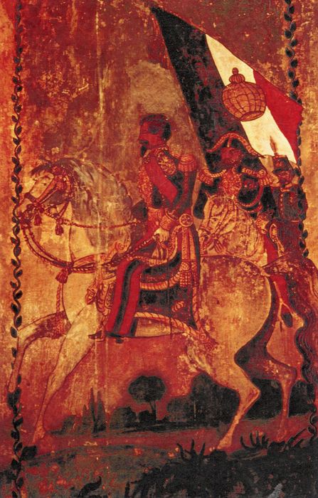Le mur sud de la salle du café-restaurant est orné d'un grand décor mural, peint à la détrempe et peut-être réalisé par un nommé Messine. L'une des peintures représente Napoléon III ; elle est probablement inspirée par une image d'Epinal : l'empereur est à cheval, en grand uniforme et tient son bicorne à la main ; il est accompagné de deux officiers, devant un paysage de pins et de cyprès. Une autre peinture représente Napoléon Ier de dos, au sommet de la colonne Vendôme.