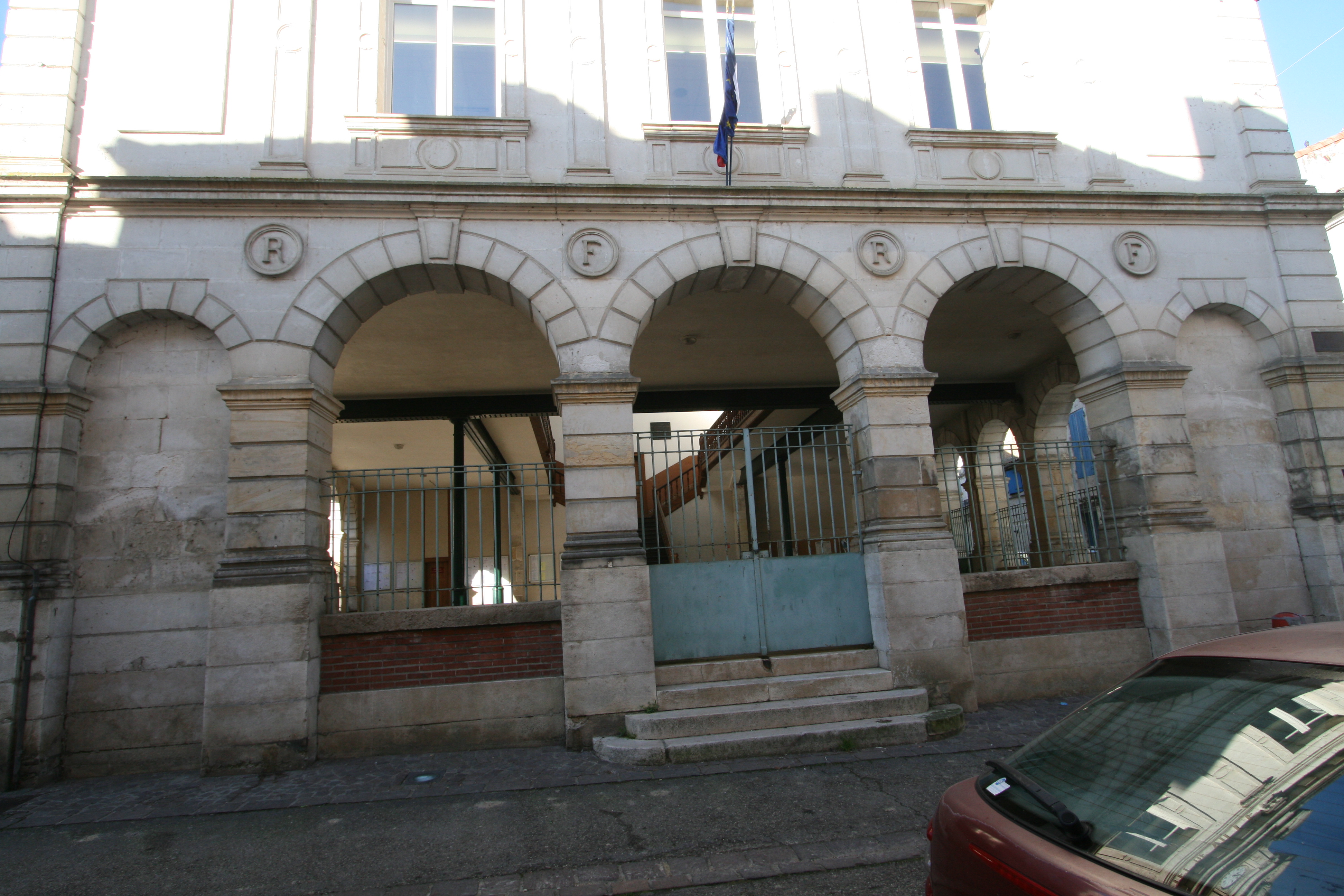 Le rez-de-chaussée est quant à lui laissé ouvert, servant à l'origine à la tenue de marchés. La façade Est est la principale. Symétrique, elle est percée par une triple ouverture et ornée au rez-de-chaussée de médaillons « R » et « F » et à l'étage de pilastres ioniques. Au sommet, elle est coiffée d'un fronton dont les courbes peuvent évoquer le style baroque. Ce fronton est orné d'une horloge et des armes de la commune. Il porte gravés la devise républicaine et le millésime 1904. Des chaînages apparents mettent en valeur les angles du bâtiment.