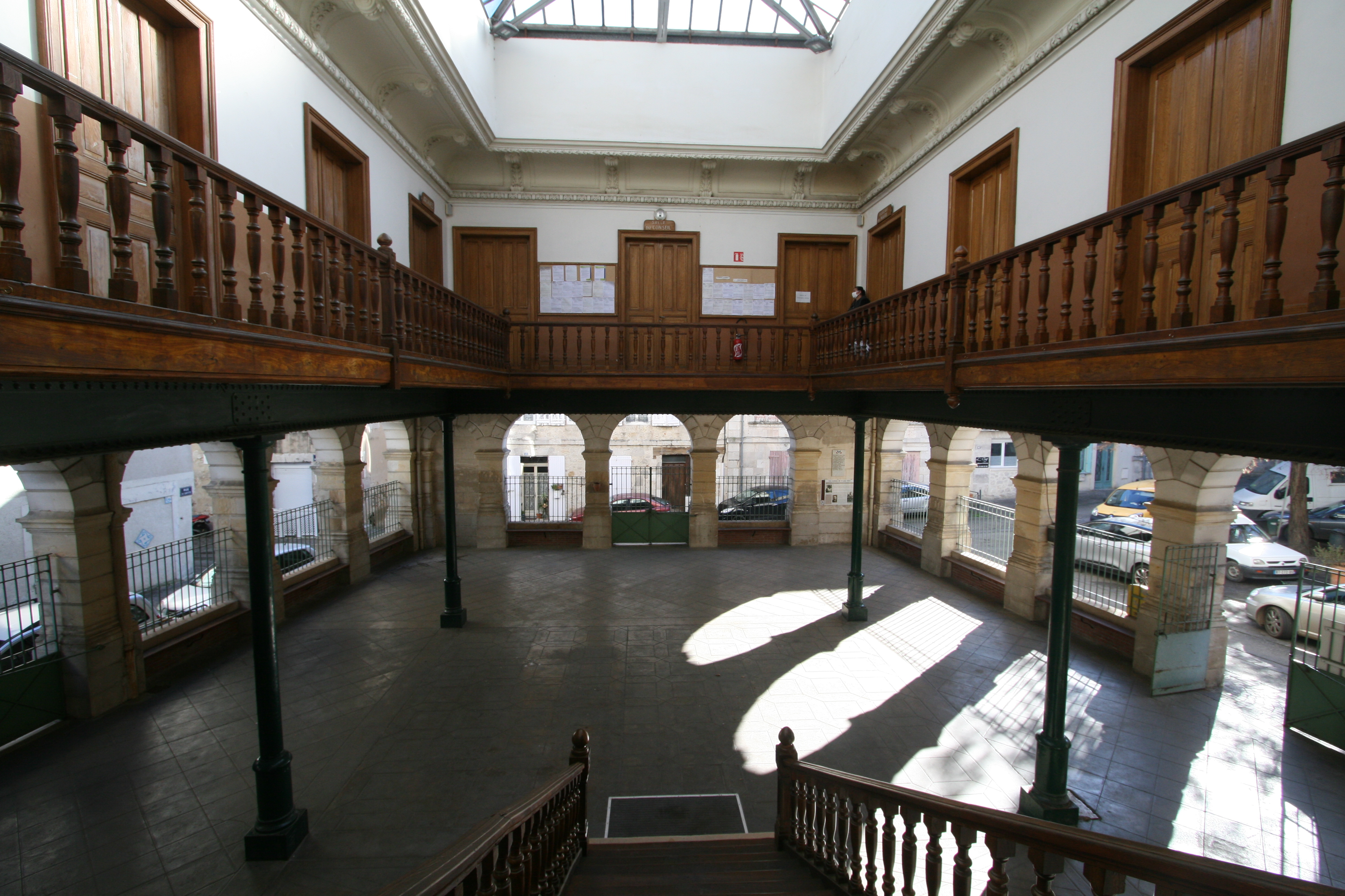Les façades Nord et Sud sont percées d'arcades et de baies rectangulaires à pourtour en anse de panier. Le parvis, laissé ouvert, compte en plus des arcades quatre piliers en métal pour porter l'étage où se trouvent les locaux de la mairie. Ces piliers portent l'inscription « Granges et cie, Agen ». Le dallage bétonné du parvis laisse voir différents motifs géométriques. Un escalier part de ce parvis et monte à un entresol où il se sépare en deux parties pour desservir la galerie faisant le tour des espaces municipaux. Les rampes de l'escalier et de la galerie supérieure sont en bois sculptées.