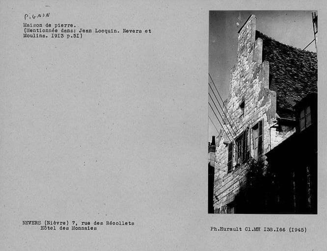La tradition fait de cette maison l'ancien hôtel des monnaies des comtes de Nevers. Maison édifiée à la fin du 15e siècle. L'intérieur a été très remanié aux 17e et 19e siècles.