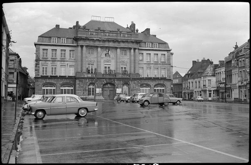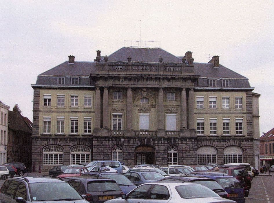 A l'origine, il s'agissait d'un hôtel de ville occupant tout le corps central, encadré de deux ailes occupées par des maisons particulières finalement absorbées par la fonction administrative au cours des 19e et 20e siècles. La responsabilité de la maîtrise d'ouvrage était répartie entre la ville et le roi, avec l'intervention du duc de Croÿ qui exerce son droit de seigneur. Ce dernier impose l'ingénieur Dubuat. Les travaux s'étendent de 1773 à 1785. La façade révèle une volonté de créer un ensemble urbain homogène, notamment dans le traitement du niveau inférieur. La partie hôtel de ville reçoit un ordre colossal, alors que les ailes latérales sont plus sobres afin de mieux différencier la hiérarchie des fonctions. En 1920, l'absorption des maisons est achevée et la séparation des fonctions n'est plus visible à l'intérieur. Le rez-de-chaussée est occupé par une ancienne halle marchande voûtée en brique, devenue salle des pas perdus. L'ancienne salle d'audience, aujourd'hui salle des mariages, a conservé intégralement ses dispositions et son décor d'origine. Il s'agit d'un édifice qui adopte un peu tardivement les formules avec quelques maladresses dans les proportions, indiquant qu'il s'agit d'un ingénieur et non d'un architecte.