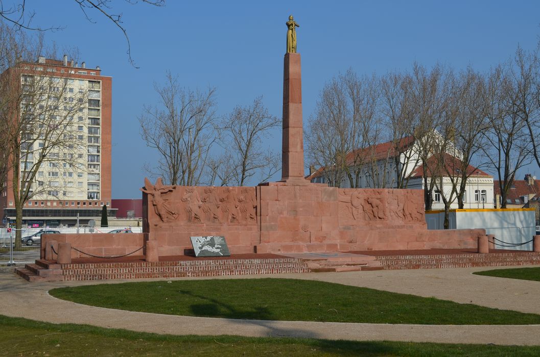 Ce monument commémoratif à la mémoire des marins français tombés au cours des combats terrestres pendant la Première Guerre mondiale est à notre connaissance, le seul monument dédié aux fusiliers-marins, arme qui s'est illustrée dans les combats de la Grande Guerre, sur terre et sur mer. Le sculpteur, Félix Desruelles, est un spécialiste du monument commémoratif et du monument aux morts. Dans la région, il est l'auteur notamment du monument aux Fusillés lillois, du monument aux morts d'Arras, de celui d'Auchel (IMH). Il réalise ici une œuvre particulièrement originale, la présentation des soldats en action emmenés par la Victoire inspirée de la frise du Parthénon, dans une version Art déco : choix du grès rose, symétrie de la mise en page accentuée par la statue de Jeanne d'Arc posée sur une colonne.