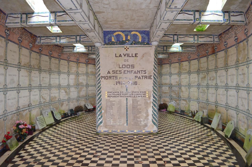 A Loos, sur 368 combattants reconnus morts pour la France, 133 font l'objet d'une demande de rapatriement, qui ne peut aboutir que si le cimetière est en état de les accueillir. Cette question se mêle à celle du monument aux morts, et la municipalité décide de regrouper les deux projets en surmontant la crypte d'un monument. C'est l'architecte Fidèle Lhermitte qui est l'auteur du projet approuvé en mai 1922, mais les variations du programme souhaitées par le maire et les malfaçons dont il tient l'architecte responsable entraine son remplacement par Alexandre Walare. Celui-ci achève le monument sur les dessins de son confrère, et conçoit les aménagements du petit jardin qui l'entoure.