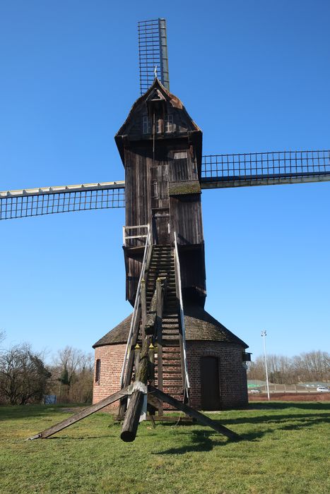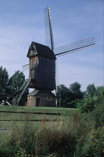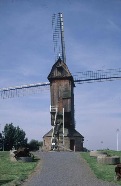 La localité d'implantation la plus ancienne dont on ait trace pour le moulin dit des olieux est Audruicq, dans le Pas-de-Calais. C'est un "tordoir" à huile construit au milieu du XVIIIe siècle. Mais il a probablement amené à Audruicq depuis une commune des Flandres. Outre que cette typologie du tordoir y était plus répandue, le moulin porte la signature d'un maitre-charpentier de moulins d'Arnèke, Ingelbertus Martinus de Smyttère. D'après une inscription sur le rouet, le moulin des olieux date de 1743 (la date du rouet, pièce maitresse, est en général celle de construction du moulin). C'est un moulin-pivot, qui fabriquait de l'huile grâce à des pilons. Sa forme est caractéristique d'un tordoir à huile, avec une cage étroite, et des poutres plus fortes pour renforcer le premier étage. La production d'huile a longtemps été une des sources de la richesse du Nord de la France, bien avant le charbon. Le sol fertile de la région permet en effet la culture de plusieurs plantes oléagineuses, dont l'usage n'est pas limité à l'alimentation (éclairage, médecine, etc..). Son activité de tordoir cesse à la Révolution. Au début du XIXe siècle le mécanisme est modifié pour en faire un moulin à farine. Les tordoirs à huiles sont en effet durement concurrencés à partir de 1814 par l'utilisation de la machine à vapeur, qui a un rendement bien supérieur et l'avantage de ne pas dépendre des aléas climatiques. La plupart disparaissent avant la Grande Guerre. Le moulin cesse son activité à la fin du XIXème siècle. En 1901-1902, il est démonté et remonté à Offekerque par son nouveau propriétaire, le meunier Alphonse Gourdin. Le moulin produit de la farine grâce à deux meules. En 1928 et 1931 il reçoit il visite d'Herman Armour Webster, artiste peintre américain passionné de moulins, qui décrit le moulin, le photographie et recueille des éléments sur son histoire. Lors de la Seconde Guerre mondiale, le moulin sert de poste d'observation aux Allemands. Il reste en activité jusqu'en 1948, date à laquelle il perd deux de ses ailes. Laissé ensuite à l'abandon, il tombe peu à peu en ruine. Vers 1954, les ailes restantes sont démontées et remontées sur le moulin Lianne, également situé à Offekerque. Vers 1960 l'entrebut suit le même chemin. Il est sauvé in extremis par l'ARAM (Association régionale des amis des moulins), qui le rachète en 1974. Cette association consacrée à la connaissance et au sauvetage des moulins a comme vocation d'une part la valorisation, et d'autre part la restauration. Décidée à monter l'exemple en matière de sauvegarde, l'association le remonte à Villeneuve-d'Ascq, sur le principe d'un musée de plein air permettant d'appréhender la riche histoire de la meunerie dans la région, sous influence flamande. Il est restauré avec soin pendant 7 ans, entre 1977 et 1983. Aucun tordoir à vent en subsistant dans la région, la décision est prise de lui redonner à cette occasion sa fonction première, celle de moulin à huile. Un maximum de pièces d'origine sont conservées et les plans du mécanisme sont étudiés à partir d'exemples anciens et de plans fournis par le spécialiste hollandais De Kramer et inspirés d'un exemple brugeois. A la valeur pédagogique et historique s'ajoute aussi l'intérêt technique avec une mise en œuvre utilisant les techniques traditionnelles, fidèles à la réalité historique.