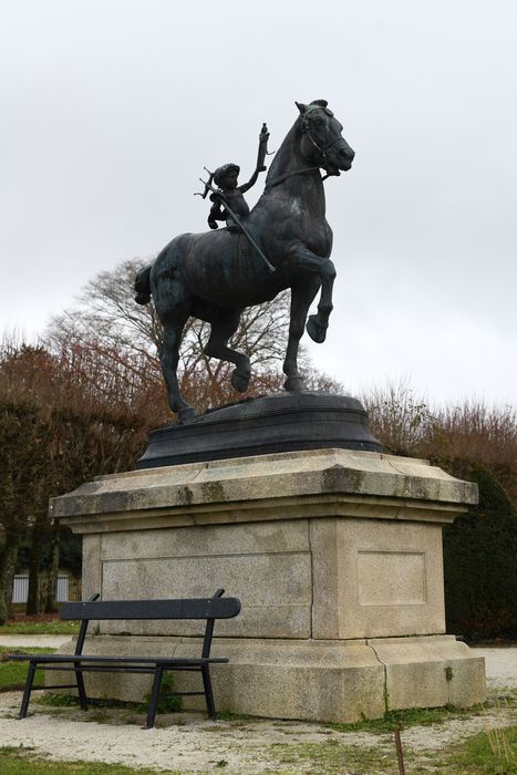 En 1866, Emmanuel Frémiet reçut commande par l'Etat d'un plâtre sur le thème de la Métamorphose de Neptune, transformé en cheval pour séduire Cérès. Le plâtre est exposé au salon en 1868 ; le bronze commandé par l'Etat en 1872. L'oeuvre rejoignit le champ de course de Mortagne, inauguré en 1878, puis les jardins de l'Hôtel de Ville. Cupidon est armé du trident de Neptune dans la main droite et présente, dans sa main gauche, une statuette de Cérès avec sa faucille. Le cheval s'inscrit dans une longue lignée de statues équestres. Le sculpteur a rendu la musculature de l'animal, fidèle à ses principes de réalisme.