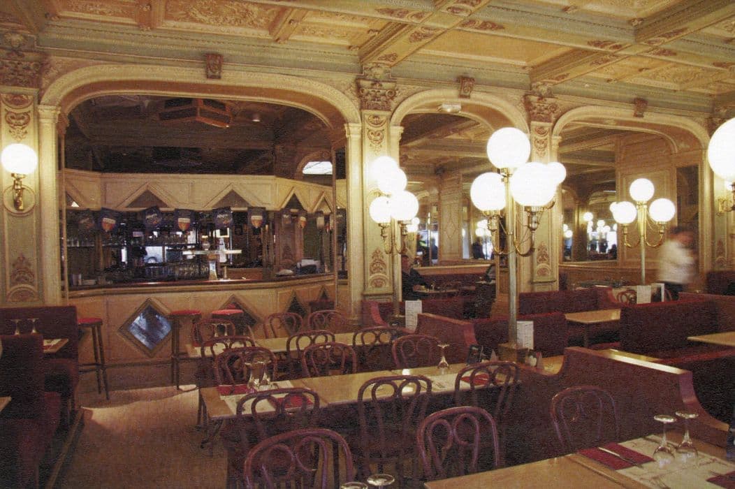 La mention du café est attestée en 1855. Le décor intérieur est inspiré de la seconde Renaissance française des années 1530. La grande salle actuelle possède des lambris peints qui adoptent une savante surcharge décorative. Les lambris d'appuis moulurés sont surmontés par des pilastres décorés de disques et d'entrelacs, eux-mêmes couronnés de chapiteaux corinthiens. Les pleins des travées font alterner vastes miroirs et niches ovales occupées par des aiguières sculptées en haut-relief. Les caissons sont peuplés de grotesques (figures d'amours, visages humains et feuillages entrelacés). Un grand caisson représente les armoiries de la ville portées par deux amours. Dans les années 1970, l'aménagement d'un bar modifié l'unité des deux salles. Placés en enfilade, le café et l'arrière-salle communiquent aujourd'hui par une ouverture centrale dont le couronnement est décoré. L'arrière salle, au décor nettement plus simple, est éclairée par une ouverture zénithale qui, à l'origine, devait prendre son jour naturellement.