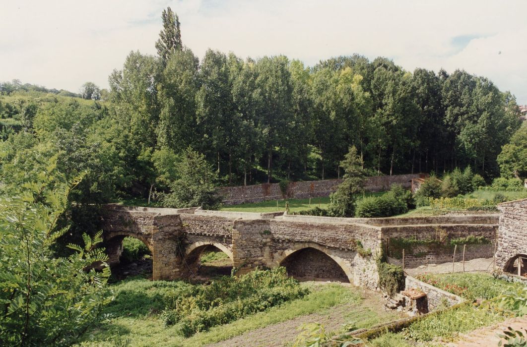Pont construit probablement au 13e siècle. Il constitue l'un des exemples les plus remarquables de ce type d'ouvrage d'art en Basse-Auvergne. L'ouvrage est représenté sur un dessin du milieu du 15e siècle, époque à laquelle les remparts étaient en cours de reconstruction et d'agrandissement. Ce pont desservait l'une des portes principales de la ville. Il se compose de quatre arches en arc brisé qui pourraient remonter au 13e siècle. Quatre piles à bec épaulent les quatre arches, ménageant des refuges délimités par les parapets. Le tablier est construit en léger surplomb, porté par des corbeaux en quart de rond renversés.