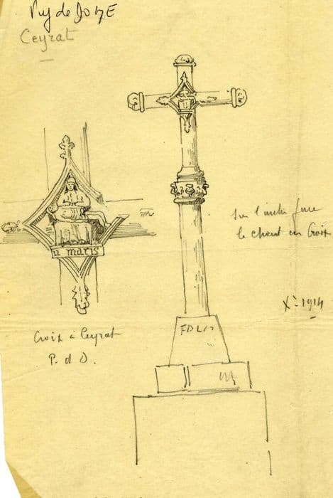 Croix probablement de la fin du 16e siècle en lave de Volvic dont le soubassement est constitué par une masse cubique surmontée d'un degré et d'un tronc de pyramide. Au-dessus, le fût cylindrique se termine par un chapiteau à feuillage supportant la croix proprement dite ; les bras cylindriques se terminent par des choux frisés. A l'intersection des bras, se trouvent deux bas-reliefs : un Christ en Croix d'un côté, une Pietà de l'autre. Cette croix a disparu (cf CRMH, 13/06/1988).