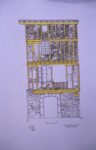 Maison de notables depuis le début du 16e siècle, résultant de plusieurs campagnes de construction du 15e au 19e siècle. L'immeuble était bordé par une cour attenante au sud, lotie au milieu du 19e siècle. Construction à pan-de-bois, à deux étages carrés sur rez-de-chaussée et étage de comble. Les éléments du décor se limitent au premier étage, par d'anciennes fenêtres à croisée de bois avec décor de pinacles et faux balustres de bois garnissant l'allège.
