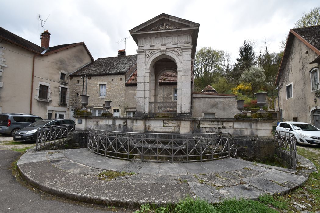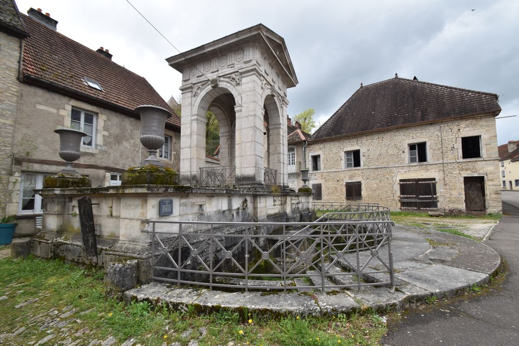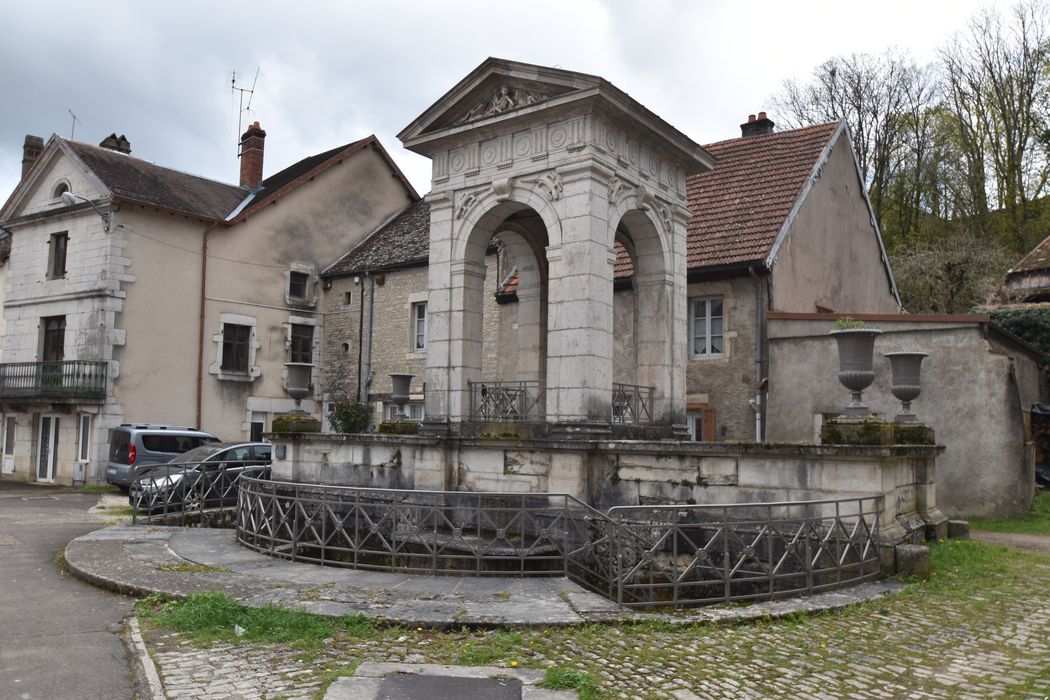 Fontaine construite entre 1830 et 1835 par les architectes César Convers et Alphonse Delacroix, à l'issue de travaux d'aménagement et d'élévation d'une source, principal point d'alimentation en eau de la ville basse. Suivant une composition pyramidale, l'édifice comprenait un réservoir de plan rectangulaire, surmonté d'un château d'eau en forme de temple dorique contre lequel s'appuyaient trois bassins concentriques en cascade. Des transformations furent réalisées en 1867, suivant les plans de l'architecte Girod de Pontarlier. Les trois bassins ont été supprimés et remplacés par un seul. Au centre a été élevé un socle en pierre de taille destiné à recevoir une statue ou un groupe sculpté.