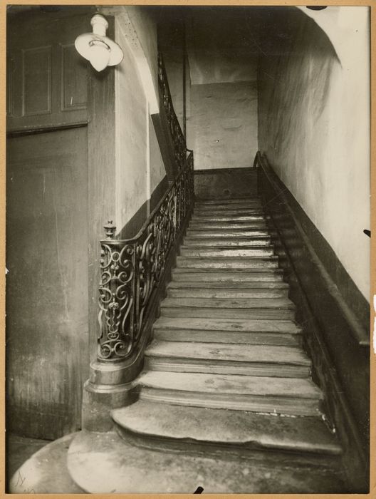 La rampe d'escalier en fer forgé. Voir notice PA00086620 (rampe transférée au 21, rue Boissonnade, 75014 Paris)