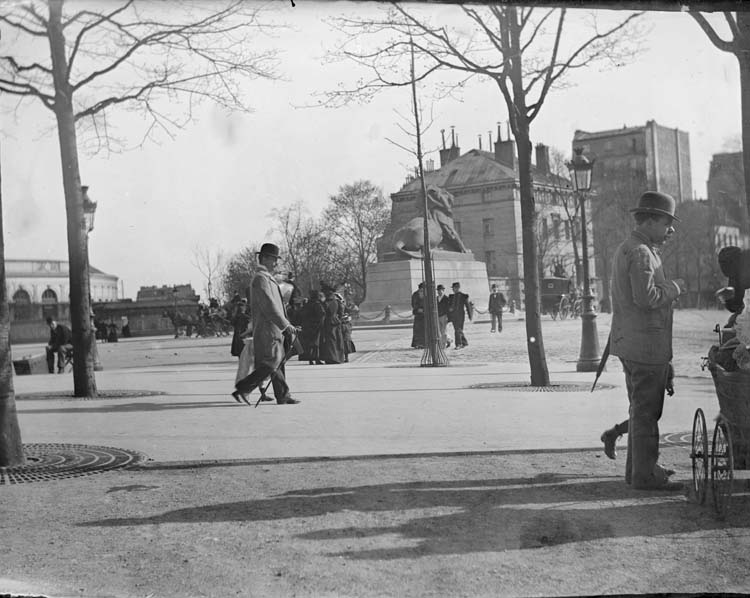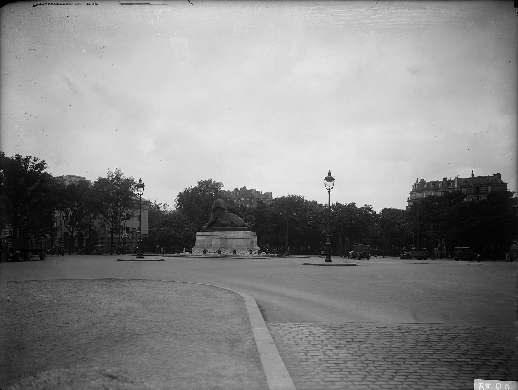 Lion édifié à la mémoire du colonel Denfert-Rochereau, défenseur de Belfort durant la guerre franco-prussienne. Sculpté par Bartholdi, l'artiste en présente un modèle en plâtre au Salon de 1878, acheté par la ville de Paris. Lion en plaques de cuivre repoussé, haut de quatre mètres sur sept de long. Un médaillon en bronze à l'effigie du colonel est ajouté en 1920. L'actuel médaillon est une substitution datant de 1979. Le lion est inauguré en 1880.