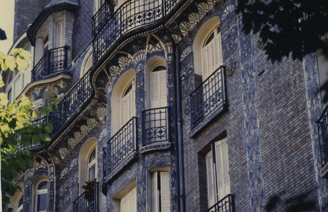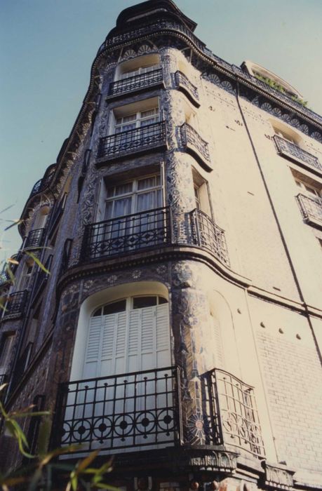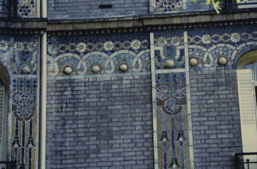 Immeuble situé en plein coeur de la villa des Ternes, construit entre 1911 et 1913 par les architectes Louis Chauvet et Maurice Coulomb. Façades extérieures et quelques parties communes décorées par Alexandre Bigot : décor de grès flammé caractéristique des dernières années de l'Art Nouveau.