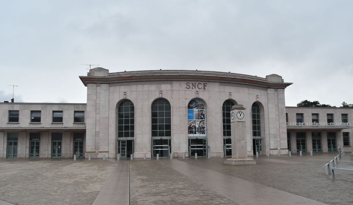 La première gare des Chantiers fut édifiée en 1849 lorsque le besoin pour la ville de Versailles d'être reliée à un axe ferroviaire desservant l'ouest de la France se fit pressant. Le choix de l'emplacement fut délicat compte-tenu des intérêts personnels de certains quartiers de la ville, compte-tenu aussi de la situation géographique du quartier des Chantiers, pressenti très tôt, qui est enclavé entre la forêt, le quartier Saint-Louis et les Etangs-Gobert. Très rapidement la station de Chantiers se révèle trop petite. Elle est doublée en 1880. Malgré cela, la gare conserve sa réputation de bâtiment exigü, non adapté aux besoins. L'idée d'une reconstruction complète germe dès 1910. En 1912, la Compagnie des Chemins de fer de l'Ouest propose des plans, signés André Ventre. La guerre et les hésitations empêchent le projet de se réaliser. De nouveaux plans sont présentés à partir de 1926, signés du même architecte. Ils seront légèrement modifiés à plusieurs reprises, jusqu'au lancement du chantier à la fin de l'année 1930. La gare est achevée en 1932. Elle se caractérise par une façade convexe s'inscrivant dans la tradition architecturale classique avec baies cintrées, pilastres et corniche. Quelques touches de modernité se lisent dans les ailes basses qui flanquent symétriquement le corps de bâtiment central. Les bâtiments situés à l'arrière sont en revanche traités dans le style des années 30. Une passerelle, contigüe au hall des voyageurs, enjambe les quatre voies ferrées pour aboutir au poste d'observation. Elle renferme les escaliers qui desservent les quais. Une gare de marchandises fut bâtie en contrebas, le long des voies, et reste donc invisible depuis la cour d'arrivée. L'ensemble est en béton armé recouvert, pour les façades du bâtiment des voyageurs, de plaques de pierre de Ladoix, polies ou adoucies selon les endroits. Une décoration de panneaux de pierre de Corrigny rose gravée scande chaque espace. L'éclairage originel en pavés de verre des voûtes couvrant les différents halls a disparu.