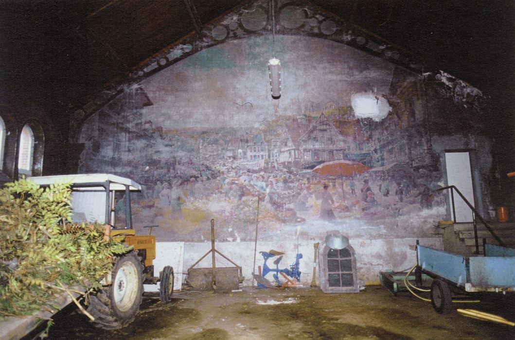 Partiellement construit sur des bases plus anciennes en 1897-1904, le château possède plusieurs dépendances dont l'ancien manège à chevaux qui se distingue par son décor intérieur. Il s'agit d'une bâtisse de plan rectangulaire pourvue, sur son pignon gauche, d'un appendice carré. Les peintures de ce manège, appliquées au-dessus d'un lambris bas, usent du trompe-l'oeil pour des scènes champêtres ou portuaires, une procession de pèlerinage ainsi qu'une vue de marché. Ce décor pourrait être daté des années 1900-1910 ou 1920.