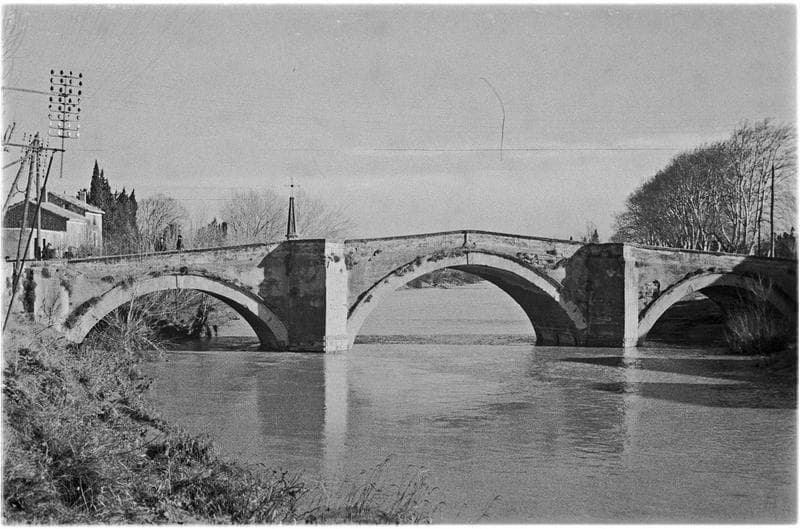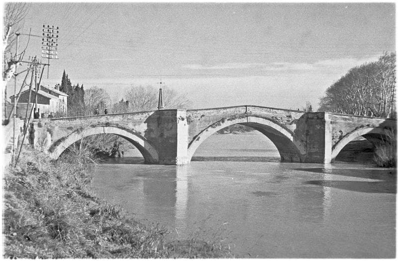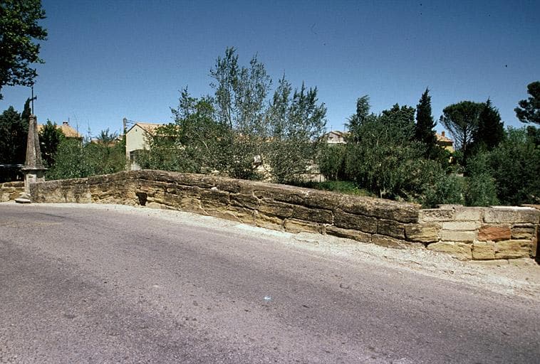 Pont bâti entre 1640 et 1644, enjambant la rivière par trois arches plein cintre soulignées par une archivolte. Les piles sont dotées de becs dont la base est animée par un appareil à bossages, réemplois d'un pont romain emporté par la crue de 1616. En 1713, une croix en pierre de Pernes fut érigée sur le pont. Les reprises des becs et du parapet pourraient être contemporaines de la mise en place de cette croix.