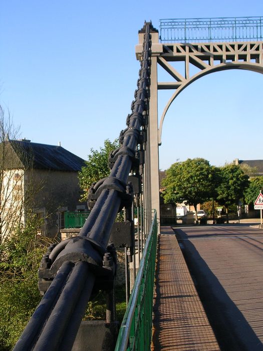Un premier pont suspendu fut construit en 1845, assurant la liaison entre les deux rives de la Vienne, puis remplacé par un nouveau ouvert à la circulation en 1932. Il fut l'objet de deux campagnes de restauration importantes en 1973 et en 1989. Il est constitué d'une grande travée centrale suspendue à deux arches et de deux travées d'accès indépendantes. Il s'agit d'un ouvrage à structure métallique avec une dalle de couverture en béton. Les pylônes sont également en béton enrobant des pylônes métalliques. Dernier pont suspendu de la Vienne, il est innovant et moderne et marque la persistance de l'acier dans la construction des ouvrages qui franchissent des grandes portées