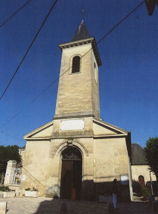 Mentionnée dès 989, la reconstruction de léglise est effectuée, daprès les plans de Vétault, en 1827. Son aspect extérieur se caractérise par la sobriété stylistique des édifices du 19e siècle contrastant avec la richesse du décor intérieur des années 1930. Jean Gaudin exécute les deux vitraux du transept, le chemin de croix en mosaïques en 1927, ainsi que le retable translucide du choeur en 1931.