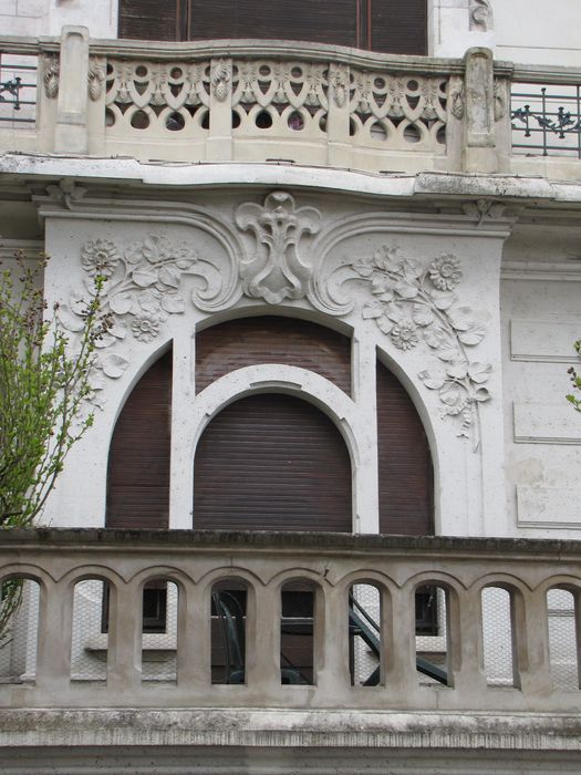 Cet immeuble de rapport, édifié en 1907 en utilisant le procédé de la pierre armée, s'élève sur un puissant soubassement couronné d'une balustrade et surmonté de deux étages percés de grandes baies et d'un étage en comble richement décoré d'une balustrade métallique. La façade présente deux avancées décorées de bas-reliefs évoquant l'art décoratif de la Belle Epoque et le style Art Nouveau.