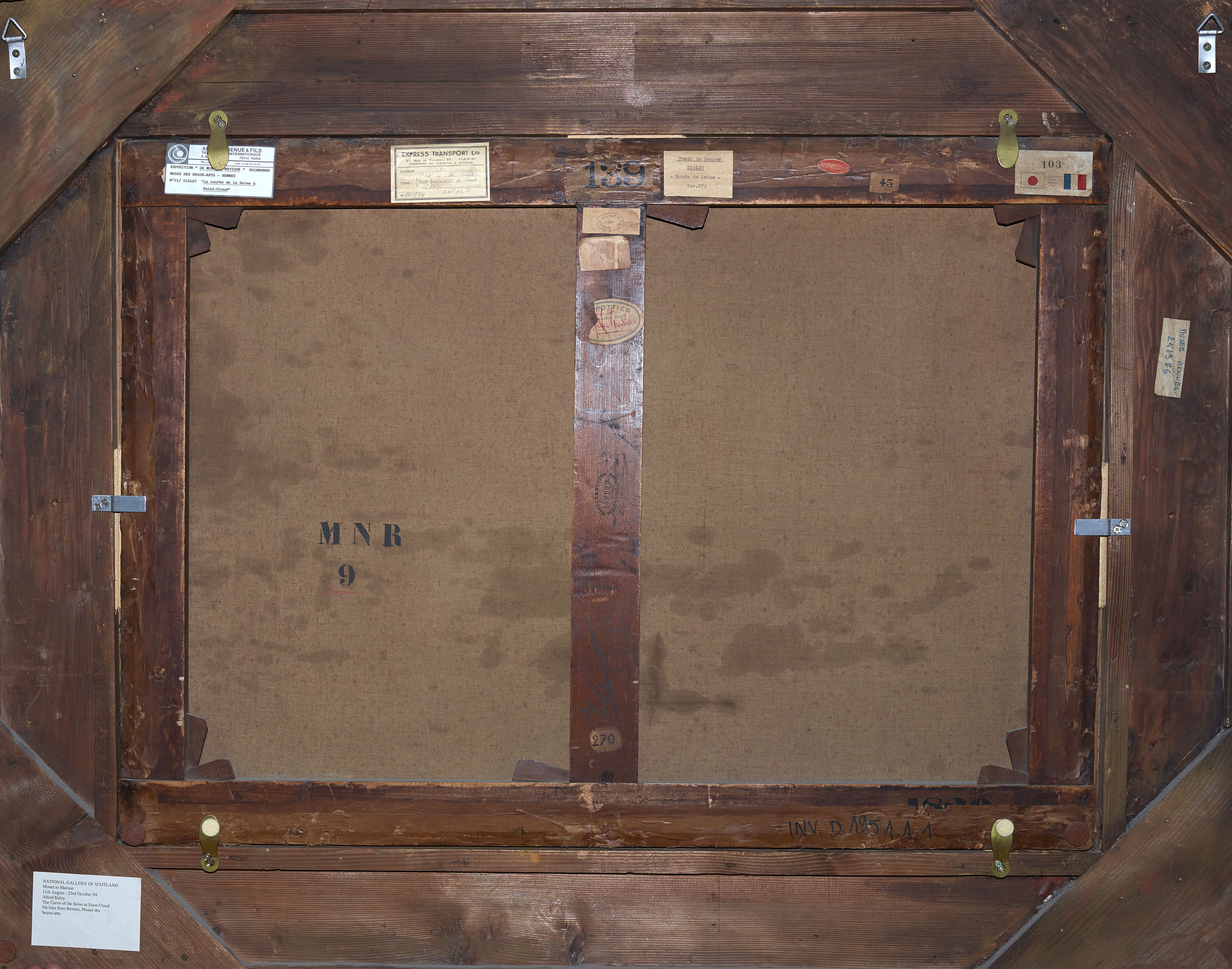 -Montant supérieur : Au droit de la traverse, étiquette rectangulaire « 139 » au pochoir ; étiquette rectangulaire dentelée, au pochoir « 45 » ; étiquette rectangulaire « Express transport Ltd/27 rue de Flandre 27 Paris 19ème/Transport de tableaux et statues/Auteur : SISLEY/Titre : Bords de la Seine/aux environs de Paris/1875/N°061 37N/0,65 X 0,91 » ; étiquette rectangulaire : « Musée de Rennes/Sisley.-Bords de Seine-.Inv. 672 ». et dessous au crayon : « ..[FI]NK » (?).