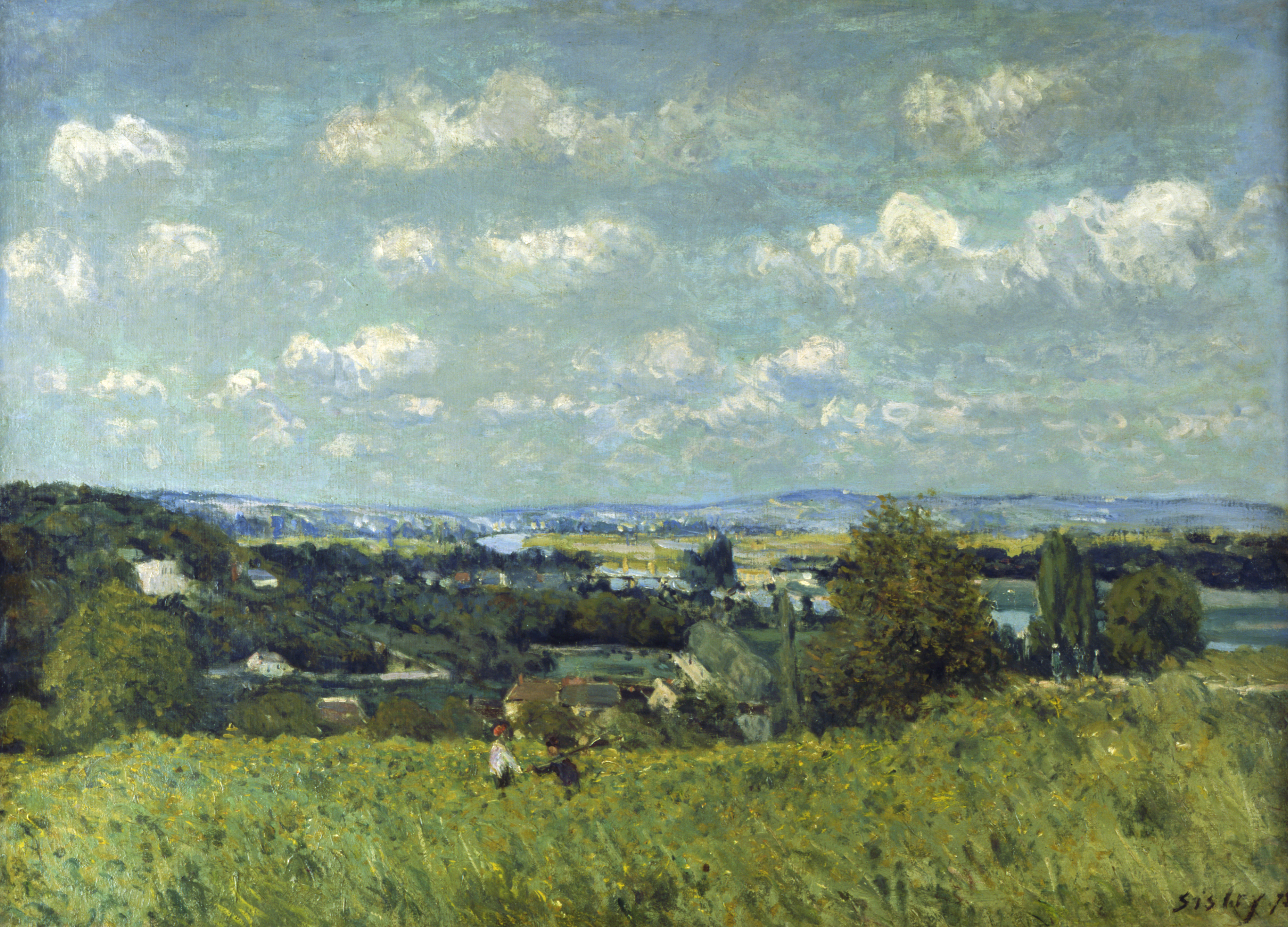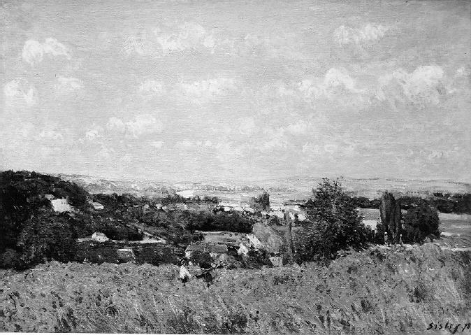 paysage (vallée, Seine, colline, ciel, feuillu, maison, champ, personnage, Louveciennes, ?)