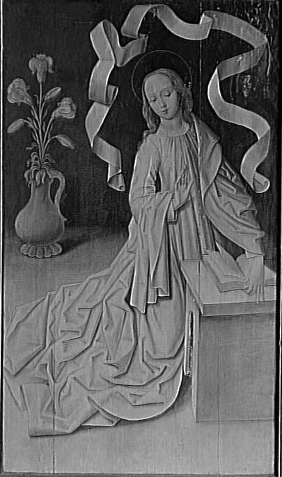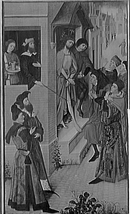 scène biblique (Procès du Christ, Pilate, jugement, foule, architecture urbaine, porte, baie) ; figure biblique (Vierge, agenouillé, Annonciation, effet de tissu, phylactère, livre, mobilier, vase, bouquet, lys)