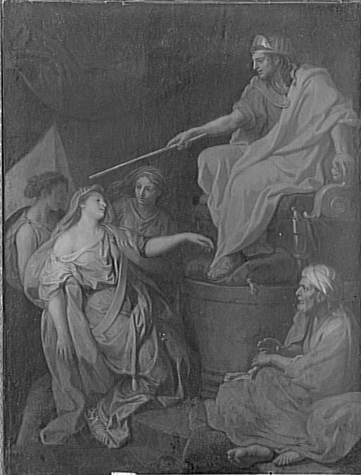 scène biblique (Assuérus, Esther, évanouissement, vieux, assis, femme, trône, bâton)