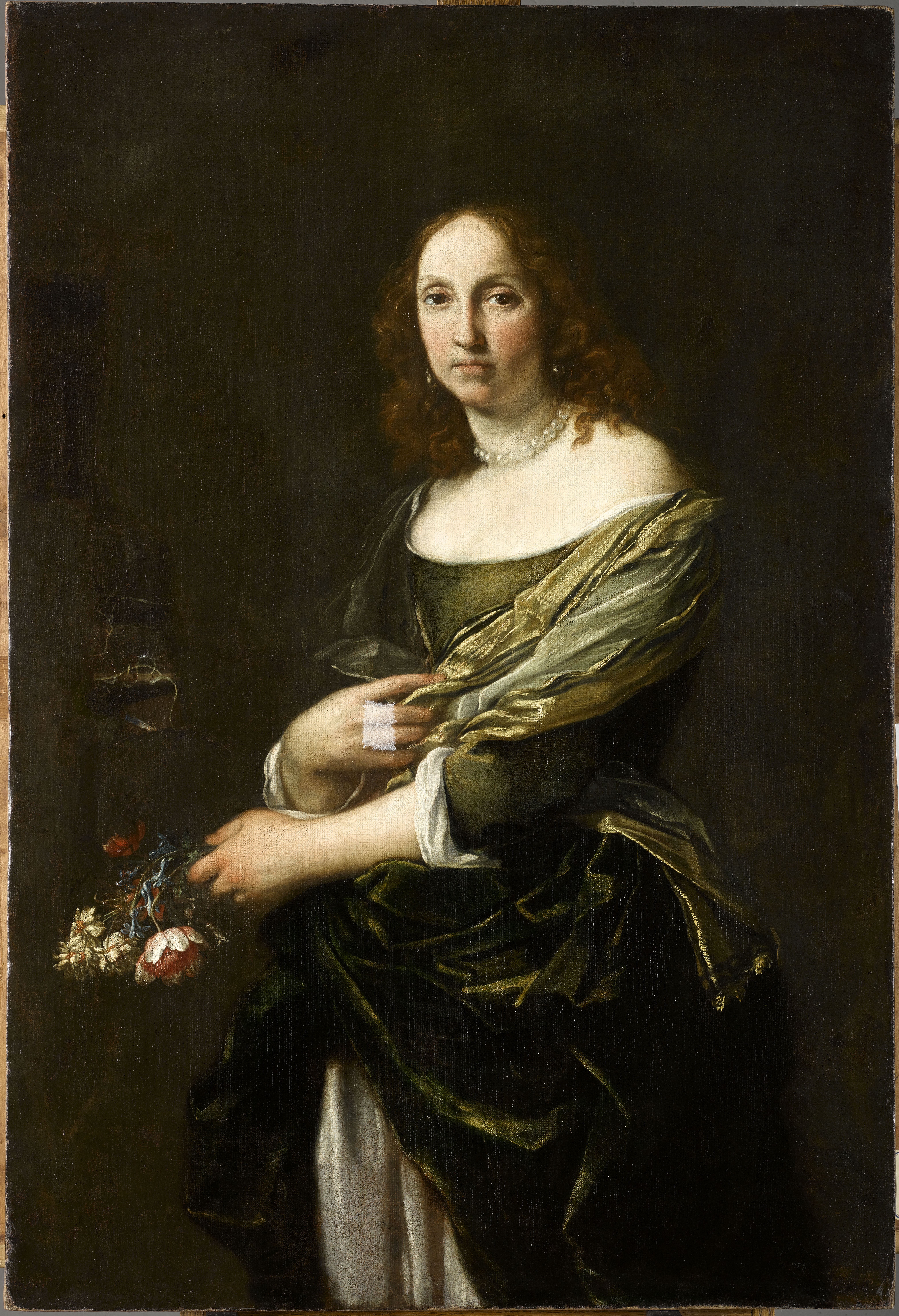 portrait d'inconnu (femme, de trois-quarts, debout, robe, soierie, bijou, bouquet : fleur)