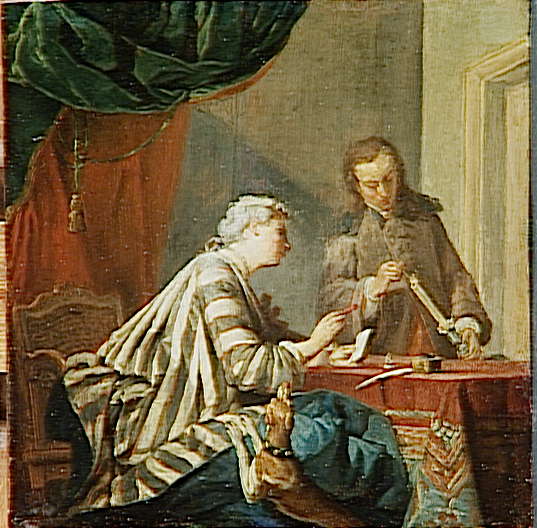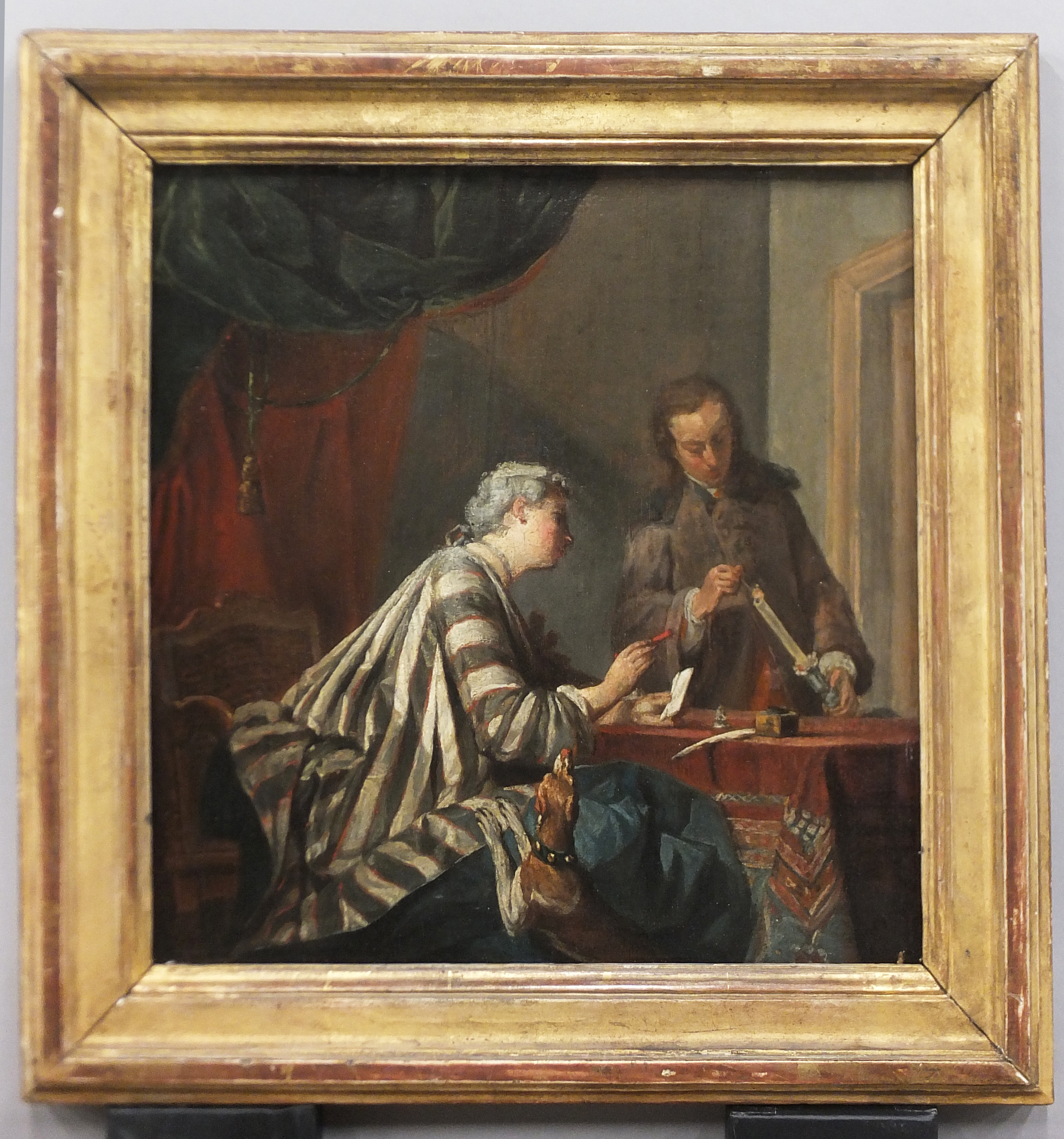 scène (femme, serviteur, instrument d'écriture : plume, lettre, chien) ; vue d'intérieur (rideau, fauteuil, table)