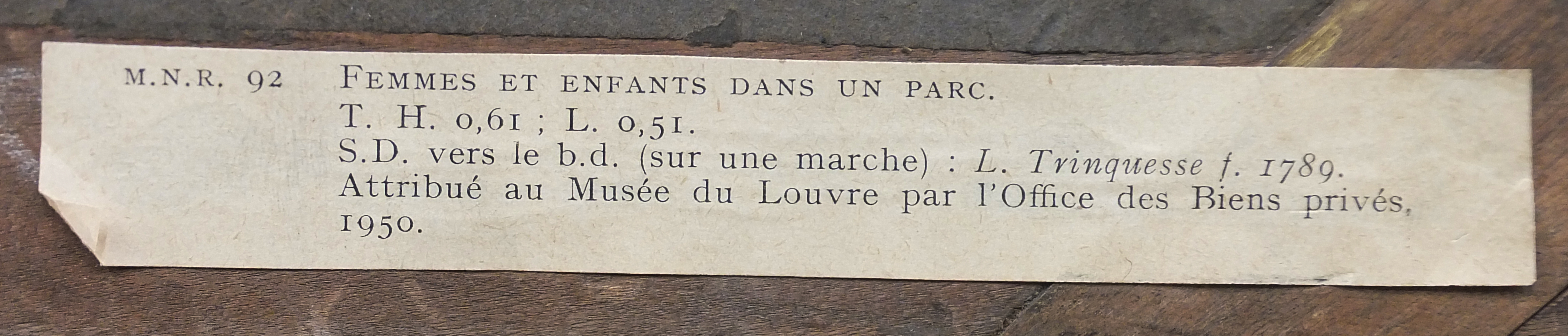 -Montant inférieur : Étiquette ronde « Fr/104 » ; étiquette rectangulaire « MNR 92 Femmes et enfants dans un parc/T. H. 0,61 ; L. 0,51/S.D. vers b.d. (sur une marche) : "L. Trinquesse f. 1789"/Attribué au musée du Louvre par l'Office des Biens privés/1950 ».