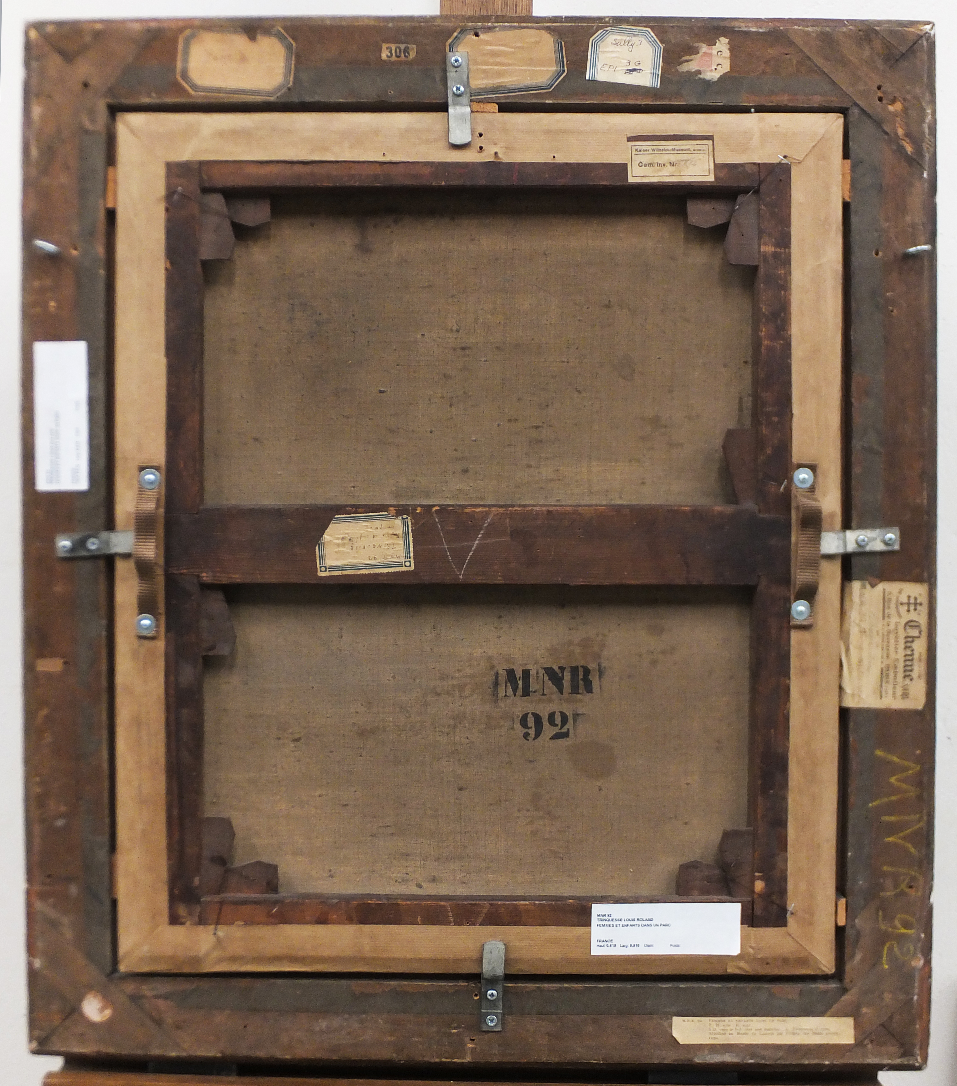 -Montant droit : A la craie jaune « MNR 92 » ; étiquette rectangulaire « Fondée en 1760/Chenue SARL/Layetier Emballeur/5 rue de la Terrasse, Paris (17°)/R.C. Seine 285 799B/Musée du/Louvre/MNR 92 Trinquesse Conversation dans un parc » et étiquette Chenue « A la (anagramme) Croix de Lorraine ».