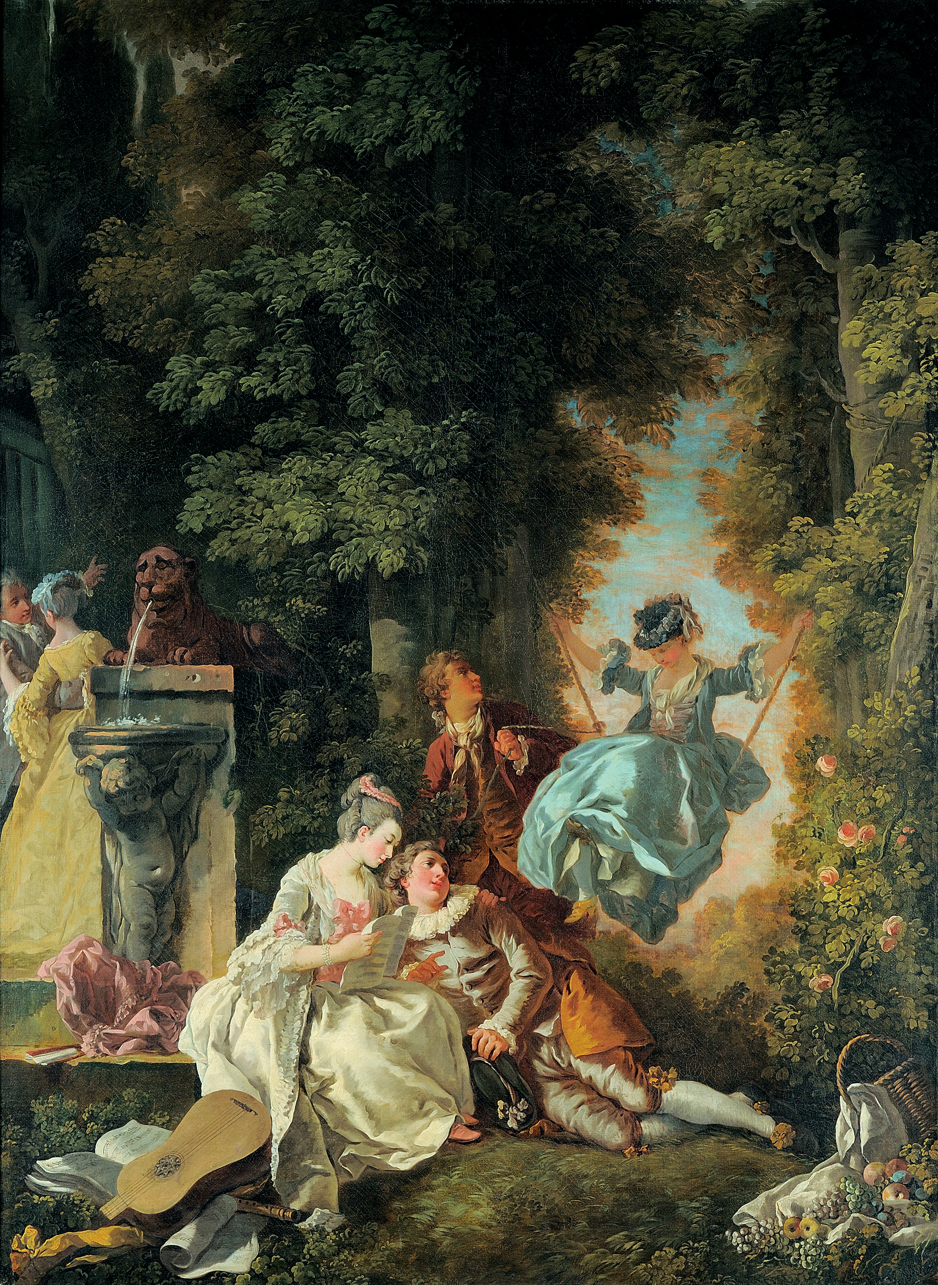 scène (homme, femme, divertissement, balançoire, galanterie, instrument de musique, partition, étreinte) ; fond de paysage (forêt, arbre, fontaine)
