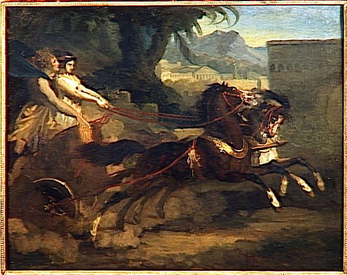 scène (jeunes gens, cheval, char, époque romaine) ; fond de paysage (ville, feuillu)
