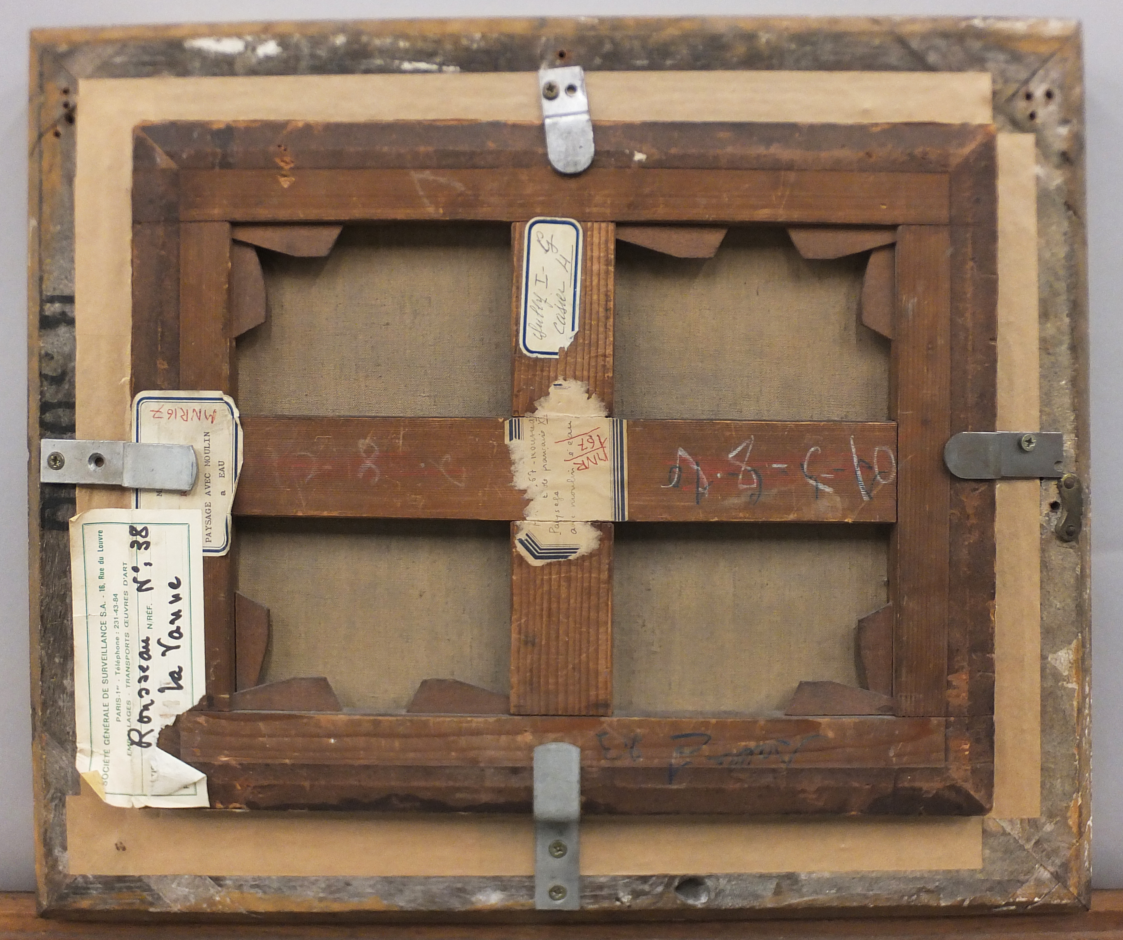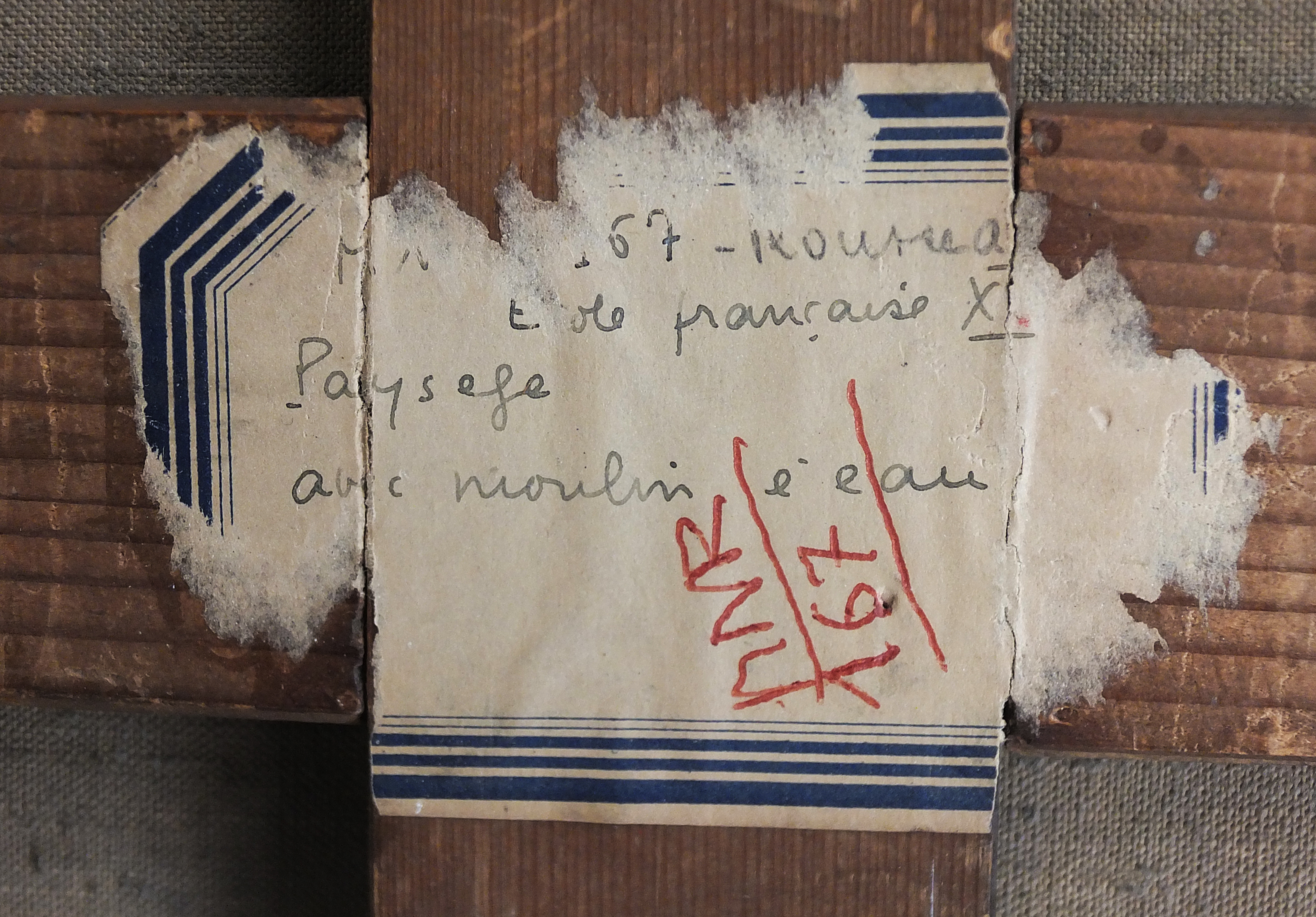 Au revers : Sur la toile : Rien. Sur le châssis : -Montant supérieur : Rien. -Montant inférieur : Au crayon bleu : « Salle 1 C23 ». -Montant gauche : Étiquette rectangulaire à liseré vert « Société générale de Surveillance S.A.-16 rue du Louvre/ Paris 1er Téléphone 231-43-84/Emballages Transports d’œuvres d'art/Rousseau N-Ref N° 38/La Vanne » ; dessous, étiquette rectangulaire à coins ronds et liseré bleu "M[NR 167]/R[ousseau]/Paysage avec moulin/à eau" et en surcharge en rouge « MNR 167 ». -Montant droit : Rien. -Traverse horizontale : A la craie blanche « B.8.C » ; à la craie blanche « S.8.C.10 » et à la craie bleue « S.4.C.10 ». -Traverse horizontale : Étiquette rectangulaire à coins coupés et liseré bleu « [M.N.R. 16]7 ...Rousseau/École française XIX°/Paysage/Avec moulin à eau » et en surcharge en rouge « MNR/167 » ; étiquette rectangulaire à coins ronds et listel bleu « Sully I G Casier 4 ». Sur le cadre : -Montant supérieur : Rien. -Montant inférieur : Rien ( ?, flou). -Montant gauche : A l'encre noire « B3 (ou 5)020 ». -Montant droit : Rien ( ?, flou).