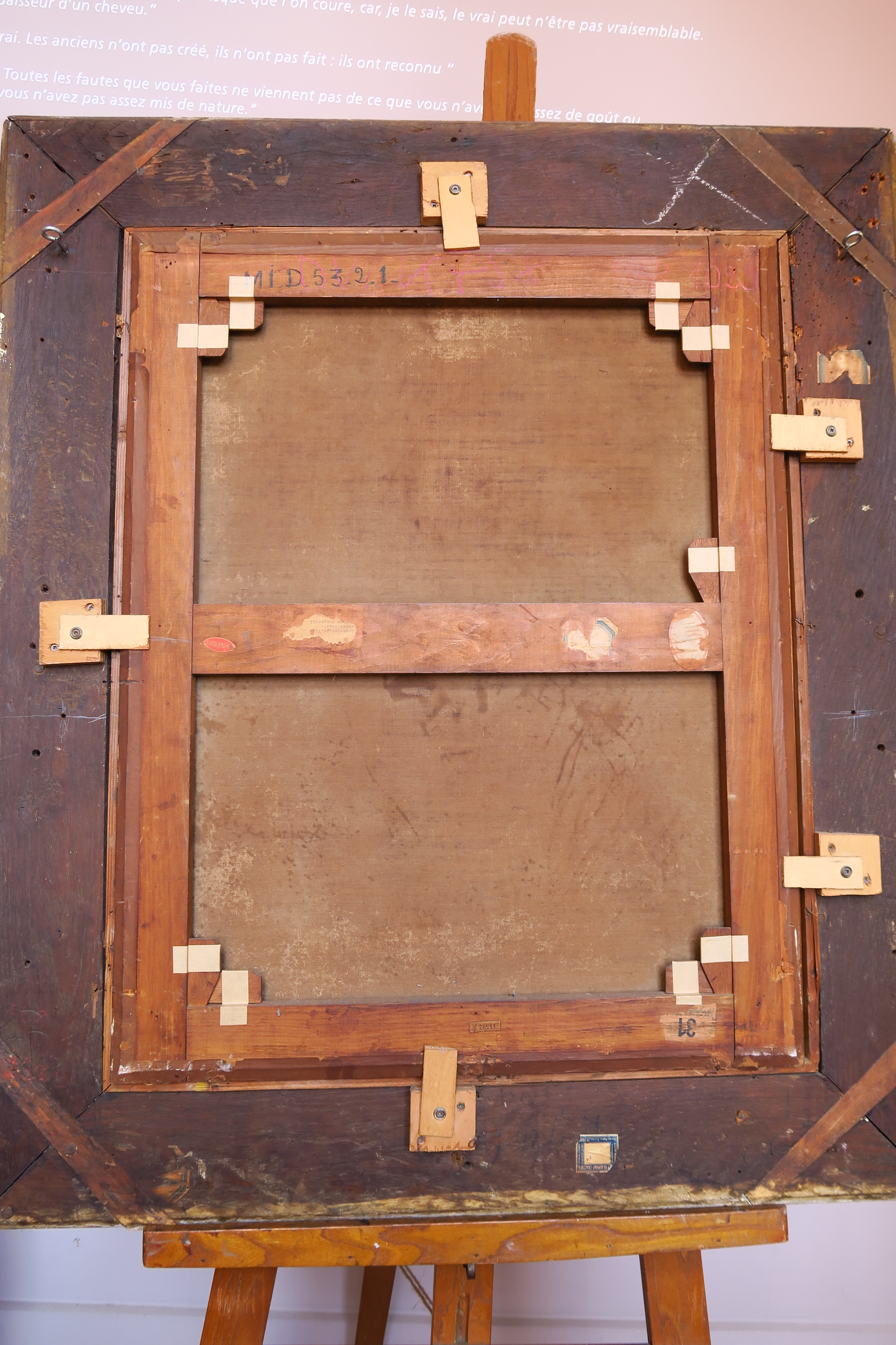 -Sur le cadre : A la craie blanche, une croix ; trace d'étiquette très lacunaire à coins coupés bordée d'oves bleues.