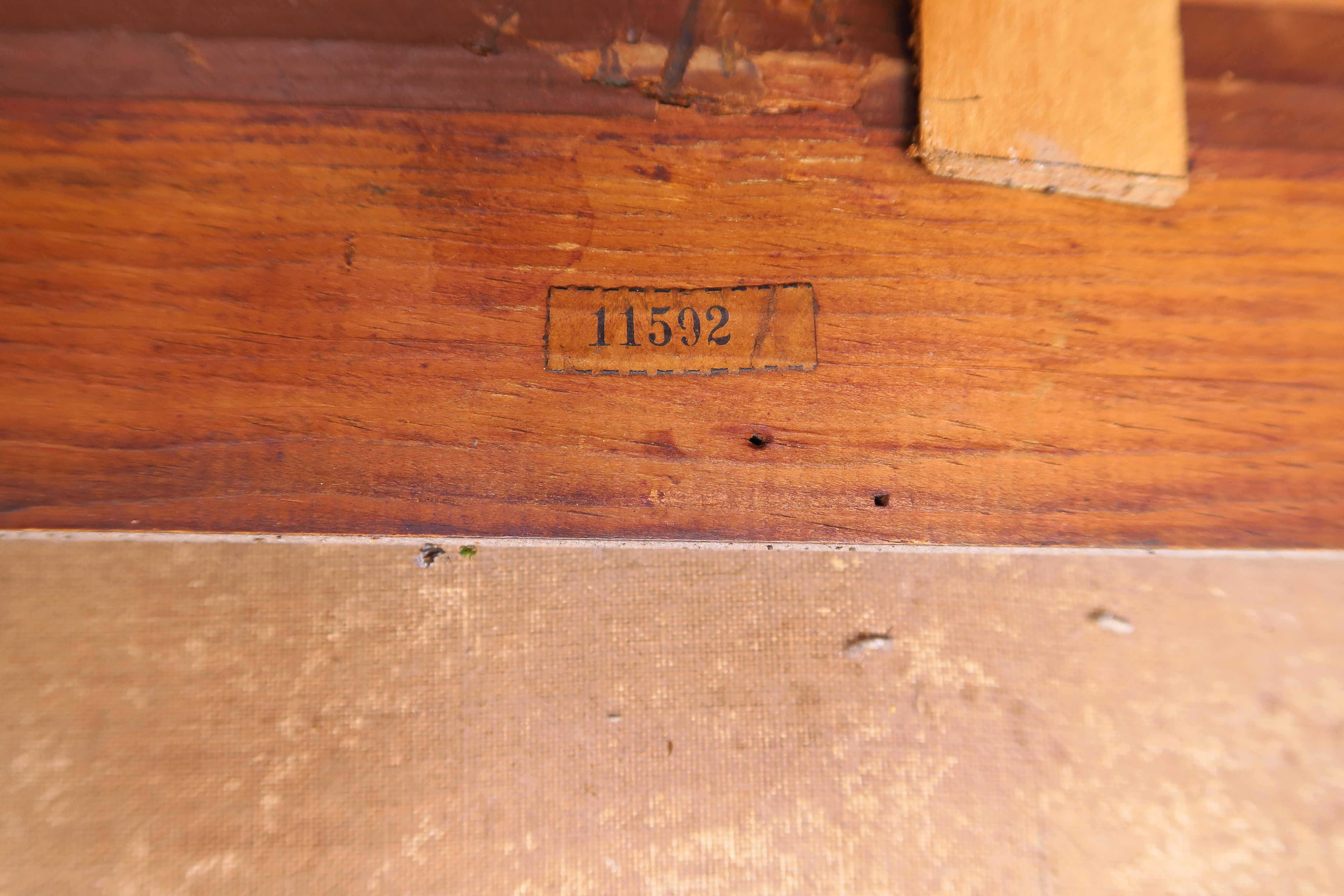 -Montant inférieur : Étiquette carrée bordée d'inscriptions bleues « [Puse]y Beaumont-Crassier/rue des Petites Écuries 25 Paris/Garde-meuble/Transports/Emballages/d'Objets d'art » ; inscription illisible « N° 9 ...» (?).
